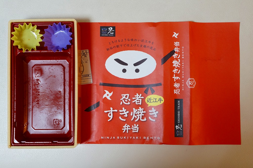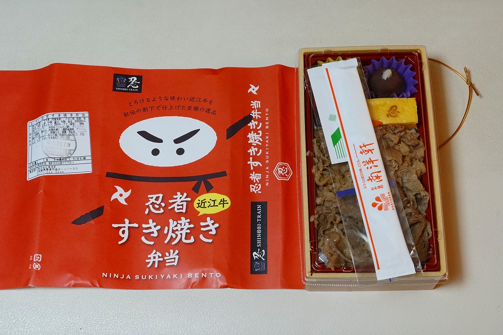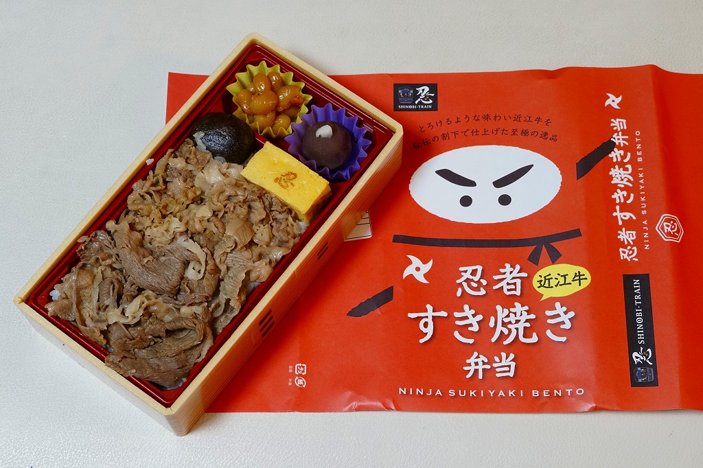 2020(令和2)年1月の京王百貨店の駅弁大会で、「忍者弁当」「忍者すき焼き&ステーキ弁当弁当」とともに実演販売。赤い掛紙には、2017(平成29)年2月発売の「忍者弁当」と同じ、忍者を思わせる構成のイラストが使われる。中身は白御飯を牛肉煮で覆い、「忍」の焼き印を持つ玉子焼、手裏剣型のニンジン、しいたけ、煮豆、うばがもちを添えるもの。詰まり中身は、上の「忍者すき焼き&ステーキ弁当」からステーキを抜いただけのはずが、不思議とあまりうまくなし。