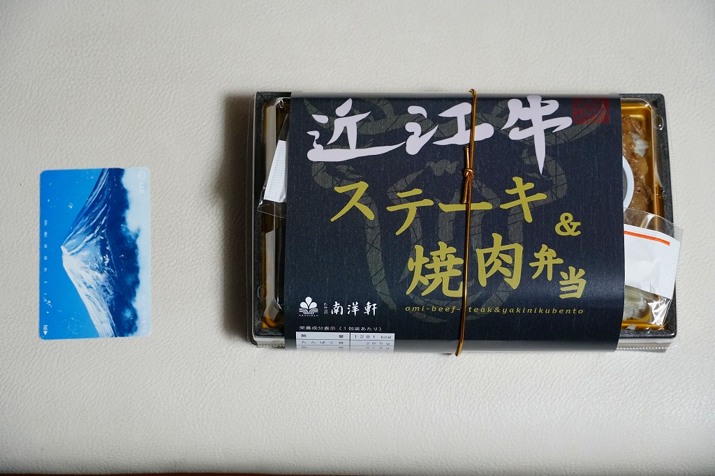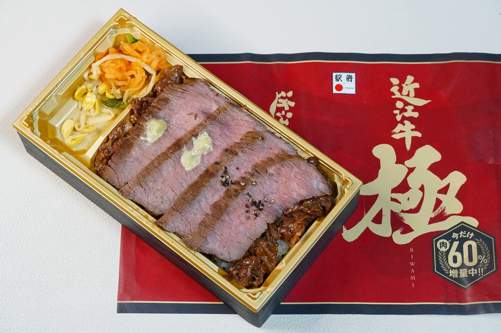2024(令和6)年1月の京王百貨店の駅弁大会で実演販売。同催事で6種類を販売した「贅沢盛り新作駅弁」のひとつとして、近江牛ステーキと焼肉を「近江牛ステーキ&焼肉弁当」より「今だけ肉60%増量中」とした。長方形のプラ容器に白飯を詰め、近江牛のステーキを4枚並べ、その焼肉ですき間を埋め、ナムルを添える。東京でこれだけの霜降り肉を食べられる弁当としては値段が手頃に思え、催事場でもよく売れていた。草津駅で売られることはないだろうが、京都駅か新大阪駅に出てくるかどうか。2025年1月の京王百貨店の駅弁大会では「近江牛極スペシャル」の名前で、肉を6切れにして実演販売。