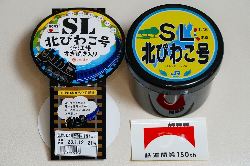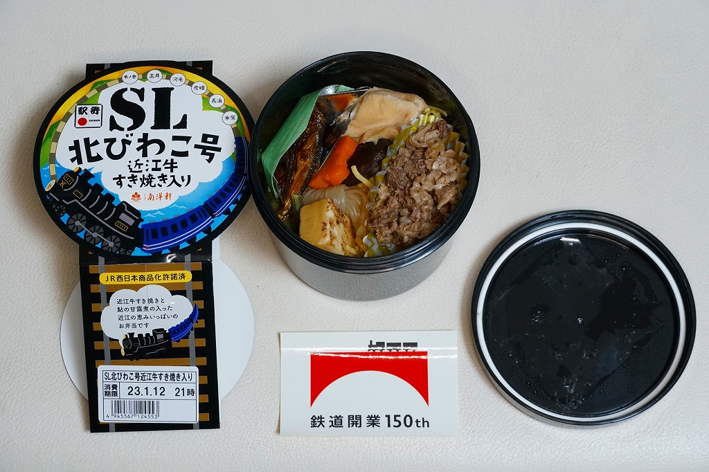 秋冬の駅弁大会シーズンに向けた、2022(令和4)年秋の新商品。容器である真っ黒なプラ製の筒は、水戸駅「奥久慈清流ライン号」や新潟駅「SLばんえつ物語」「SLばんえつ物語磐越西線めぐり」と同じもの。これに「SL北びわこ号」のヘッドマークの絵柄を印字し、その名前や汽車を描いたスリーブに収める。中身は味付き飯を近江牛のすき焼きで覆い、鮎の甘露煮を添えるもの。高額であるものの、地の物は入る印象。このシーズンの半年間で終売か。
