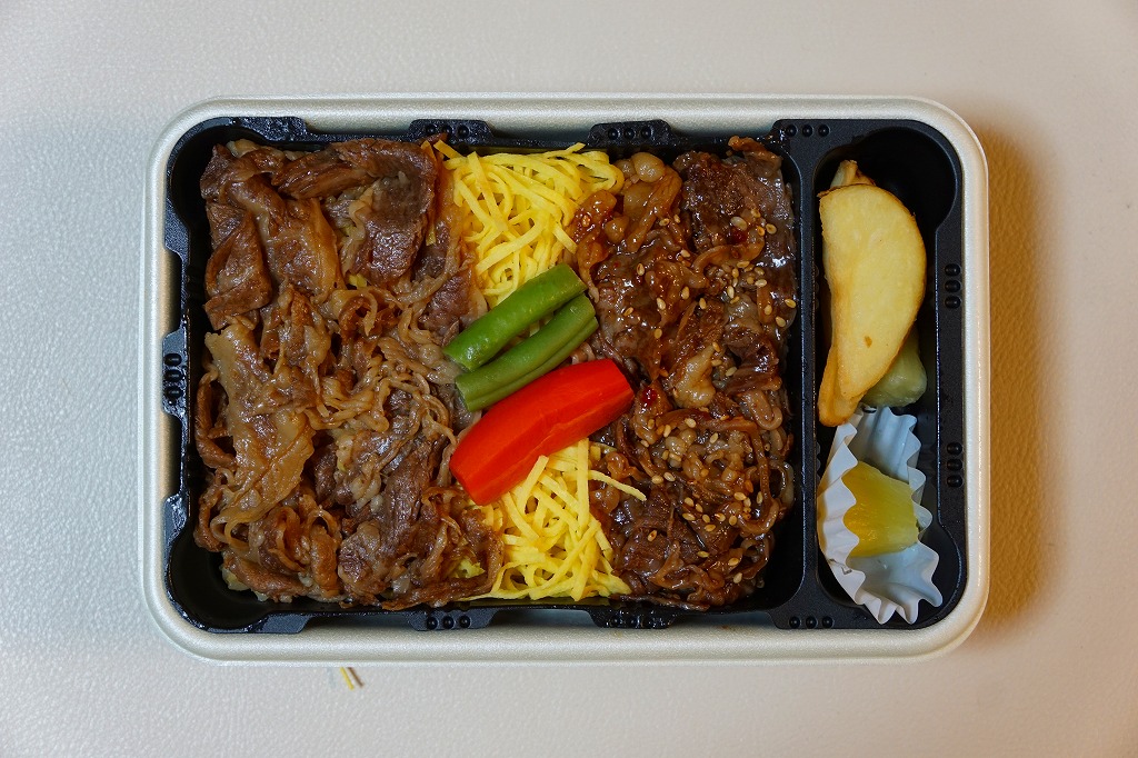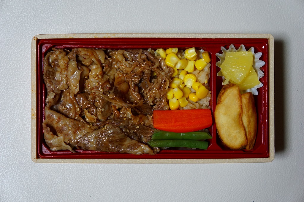 秋冬の駅弁大会シーズンに向けた、2014(平成26)年秋の新商品か。黄色いボール紙枠に収めたプラ製容器の中身は、御飯の3分の2を牛焼肉で覆い、残りをコーン、にんじん、いんげんで覆い、パイナップル、ポテトフライを添えるもの。肉は見た目でタレ満載、広げると霜降り、食べると焼肉が香る。ありふれた牛肉駅弁のひとつではあるけれど、付合せによりファミリーレストラン風にできていると思った。2018年秋冬のシーズンまでの販売か。
