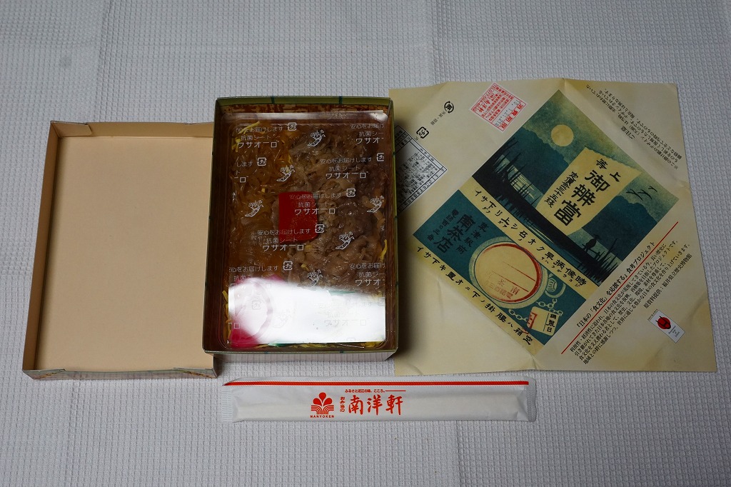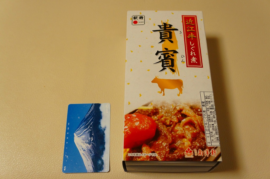 2013(平成25)年10月の発売。御飯を牛肉煮と錦糸卵で覆い、インゲン、レンコン、漬物、「永源寺蒟蒻」なる赤い玉こんにゃくを添える。つまり、駅弁でもよくある牛丼。牛肉はとても少量だが、味付けと素材、特に脂肪に甘みがあった。また、駅弁の名前と、真っ白な表面加工ボール紙を組み立てて枠を厚くした容器で、高級感を出していた。価格は2014年の購入時で980円、2017年時点で1,010円。2018年までの販売か。