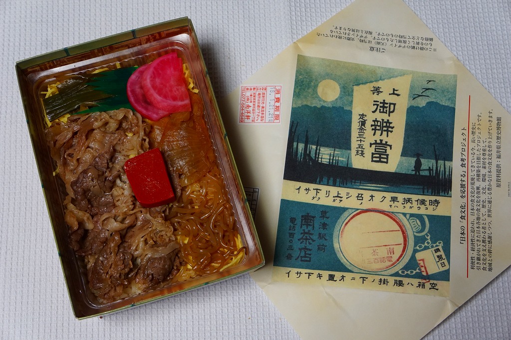 2018(平成30)年1月の京王百貨店の駅弁大会で、草津駅の復刻駅弁として販売。福井の駅弁催事業者のプロデュースのようで、実際に草津駅で売られることはないだろう。昔の草津駅弁の掛紙の絵柄を印刷した掛紙を使用、竹皮柄のボール紙の容器に収まる透明のトレーに詰めた中身は、白飯を牛肉、糸こんにゃく、たまねぎ、ネギ、錦糸卵、赤かぶらなどで覆う牛すき焼き風弁当で、「近江牛すき焼き弁当」とだいたい同じ。