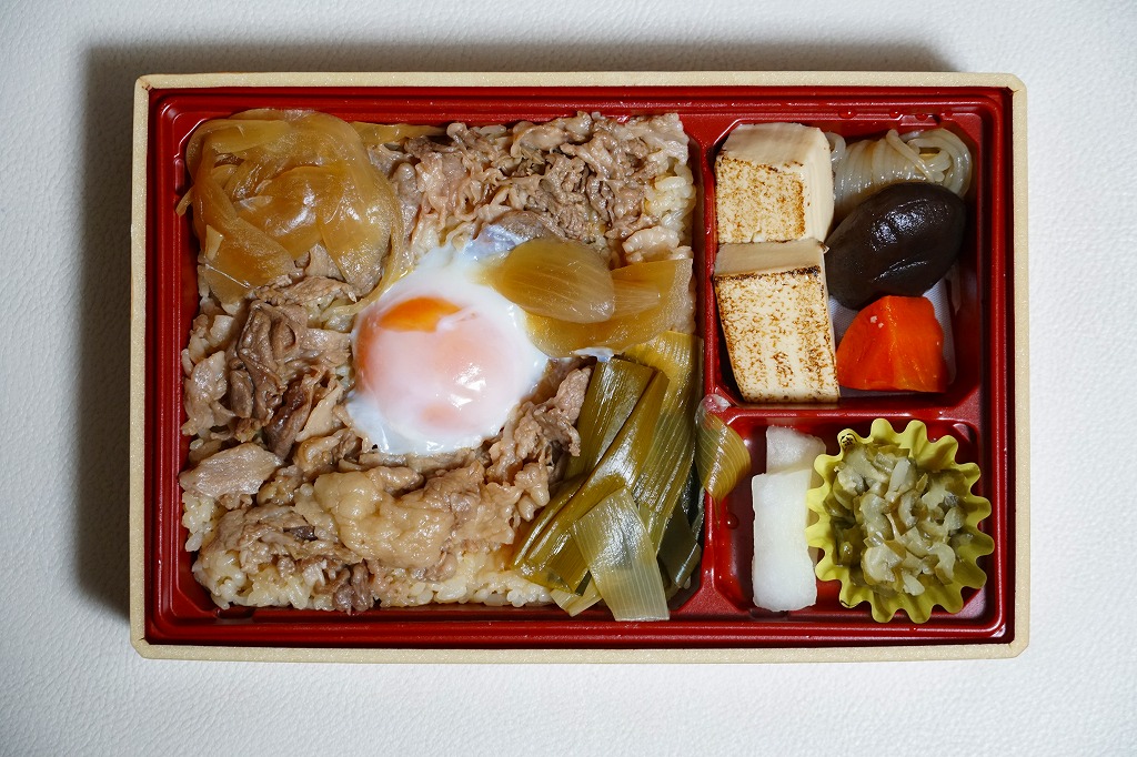 2008(平成20)年の春頃に発売か。2018(平成30)年6月までのリニューアルで、長方形のプラ容器を黒いスリーブにはめる姿になり、写真でなく日本語と英語の文字で弁当を宣伝する。中身は割り下の御飯を牛肉煮で覆い、タマネギと青ねぎの炒め物を添えて温泉玉子を落とし、焼豆腐、糸こんにゃく、しいたけ、にんじんを添え、きゅうりと大根の漬物を置くもの。