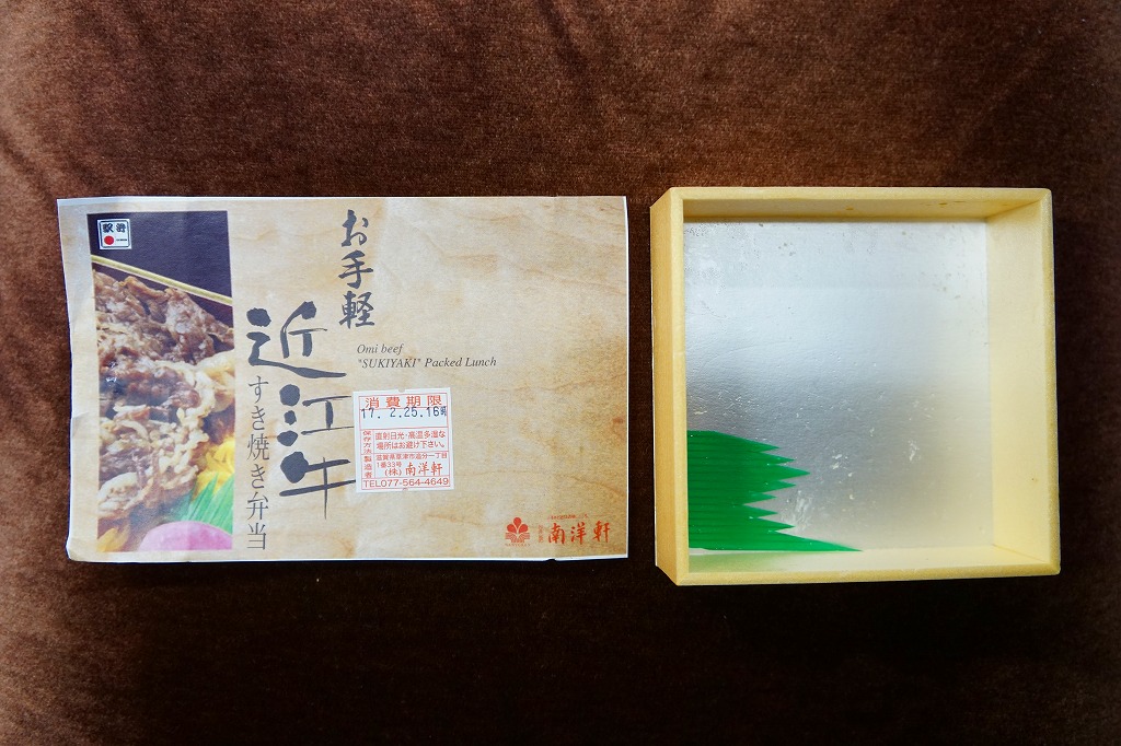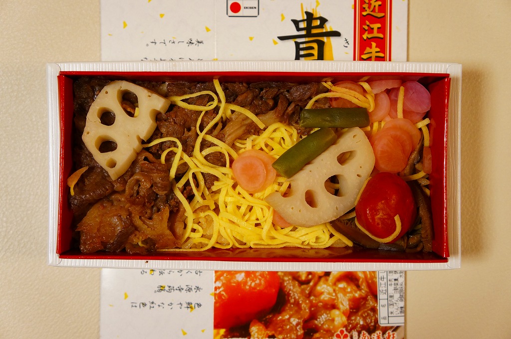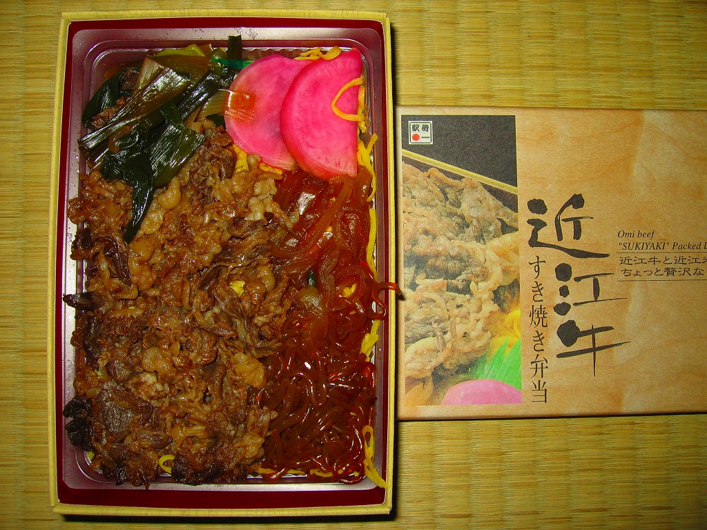 中身はつまり、近江牛すき焼き弁当。御飯を牛肉煮、糸こんにゃく、錦糸卵で覆い、タマネギ煮、青葱煮、日野菜漬を添える。肉の脂身が少なめで赤身が多めであること以外は、いつもの草津駅弁、あるいは京都駅や新大阪駅や駅弁大会の弁当と、同じような味がする。