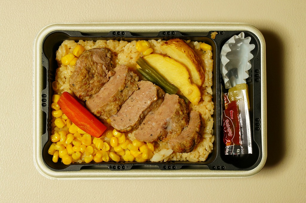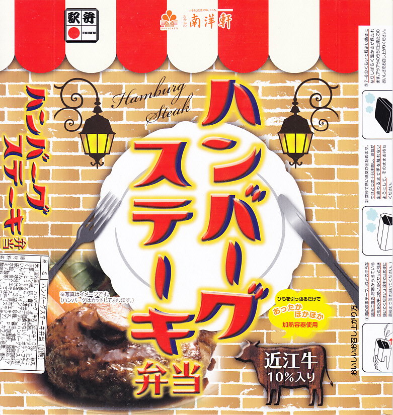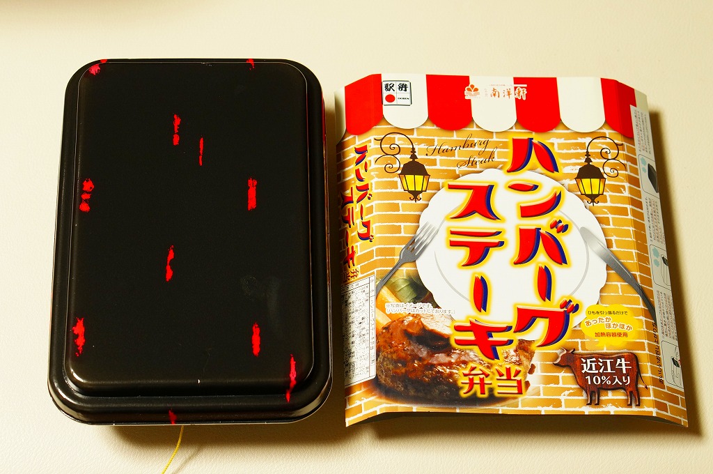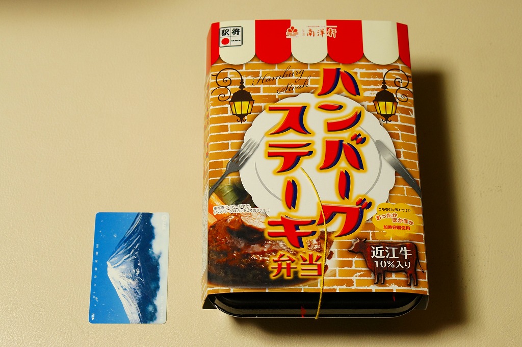 秋冬の駅弁大会シーズンに向けた、2014(平成26)年秋の新商品か。駅弁では意外に少ない、ハンバーグ弁当。長方形の加熱機能付き容器に茶飯を詰め、牛肉ハンバーグのスライスを並べ、コーンとニンジンとインゲンとフライドポテトで彩り、パイナップルとデミソースを添える。「近江牛10%入り」の棒ハンバーグを含め、えらくあっさり、さっくりした風味で、ソースの味も薄く、どこにも書いてないがヘルシーな印象を受けた。2018年秋冬のシーズンまでの販売か。