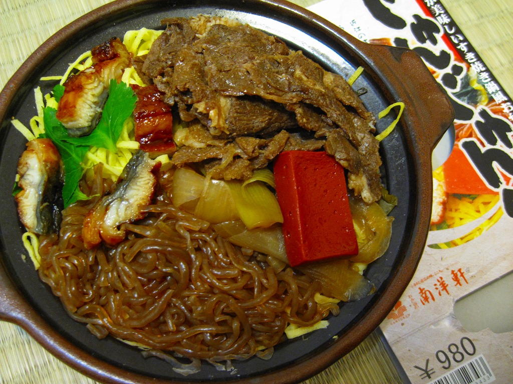 秋冬の駅弁大会シーズンに向けた、2009(平成21)年秋の新商品か。昭和の頃の鍋駅弁と違い、そのままミニミニ鍋料理に使えそうな土鍋を容器に使用、これを中身のイメージ写真や駅弁の名前を印刷したボール紙の帯で留める。中身は茶飯の上を錦糸卵、牛すき焼き肉、糸こんにゃく、長ネギ煮で覆い、三つ葉とウナギと赤こんにゃくを添えるもの。2012年頃までの販売か。