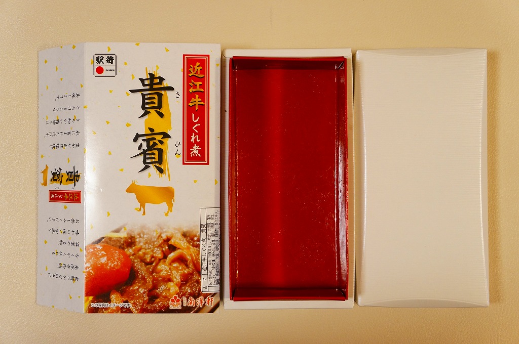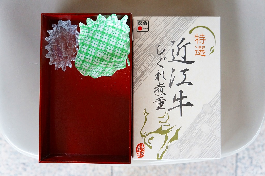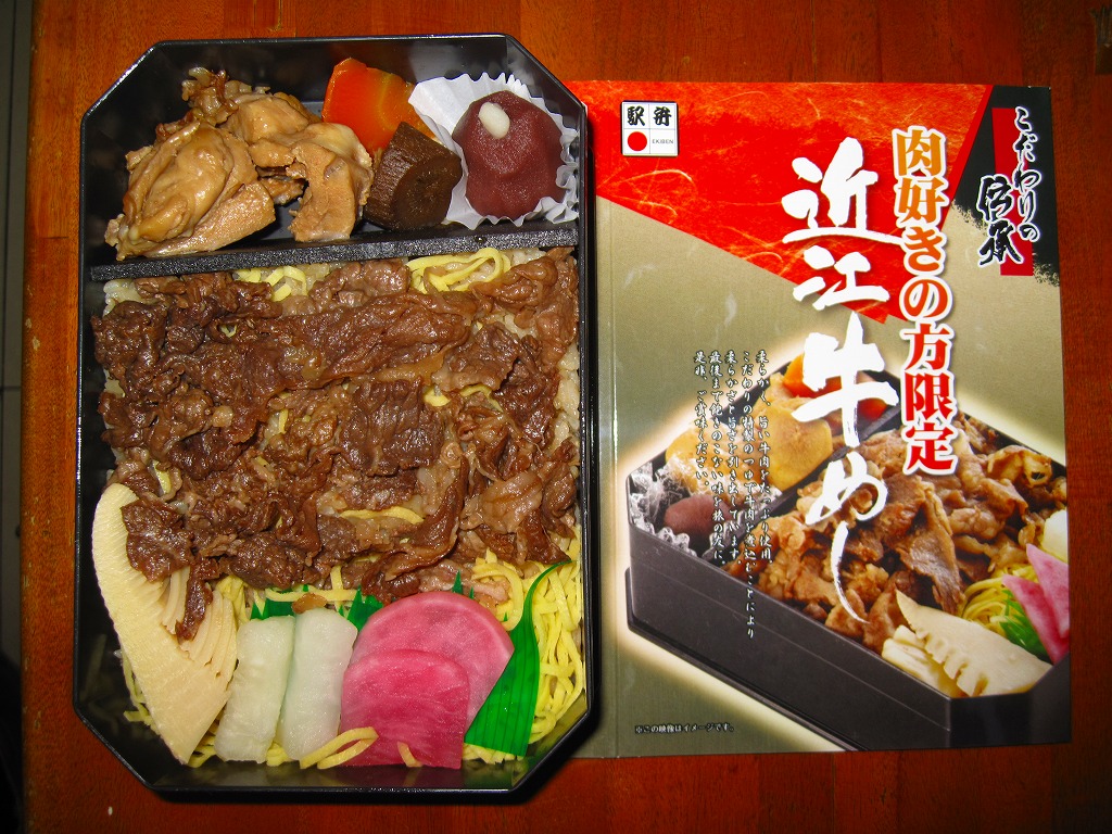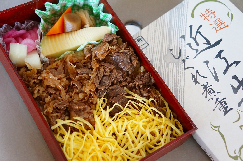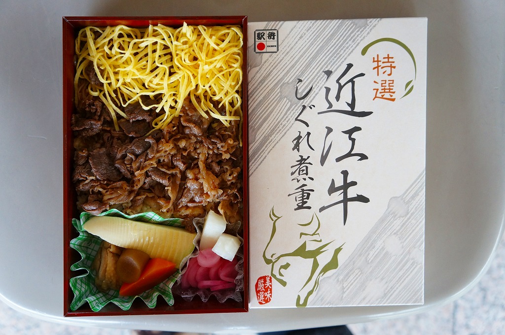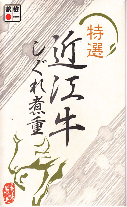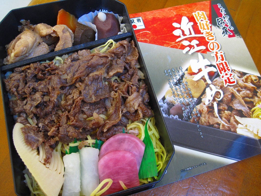 見た目と質感と固さが木のようなボール紙製の容器に御飯を敷き、近江牛しぐれ煮と錦糸卵で覆い、ダイコンや鶏肉などの煮物と日野菜漬などを添えるもの。とても甘く味付けされた薄く色濃く少量の牛肉は上品な感じ。草津駅でもきっと予約販売が実施されているはず。2015年頃までに東京駅での販売はなくなったようだが、新大阪駅の駅弁売店「旅弁当にぎわい」で時々、実演販売をしている模様。価格は2012年の購入時で1,470円、2018年4月には1,500円で販売。2020年までの販売か。