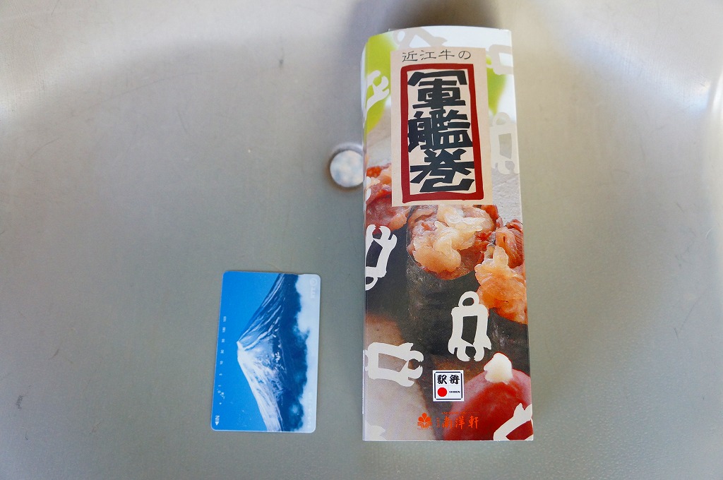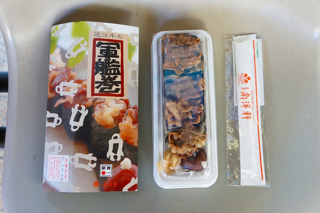 小さくとても細長い惣菜向けプラ容器に、白御飯に牛肉煮を載せて海苔を巻いた軍艦巻が5個並び、うばがもちと生姜が添えられる。草津駅弁はその名のとおり、牛すき焼き肉の軍艦巻が5カン。下記のとおり同じ売店で同じような牛肉駅弁を食べ続けていたので、相変わらずの近江牛を含め海苔や酢飯にも味に関して感想はなく、一方で草津宿や駅弁屋と深い関係にある「うばがもち」を1個詰めていることが最大のセールスポイントではないかと思った。価格は2012年の発売時や購入時で980円、2014年4月の消費税率改定で1,010円。2018年頃までの販売か。