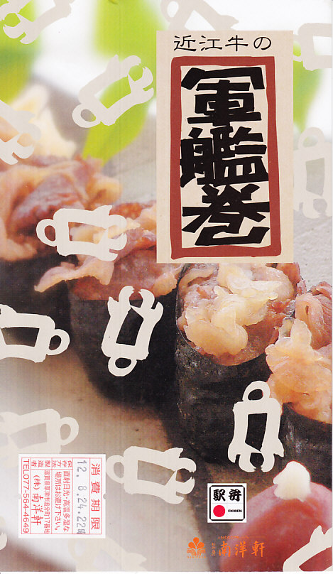 東京駅の駅弁売店「駅弁屋 祭」で販売するために、この売店の開店日である2012(平成24)年8月7日に東京駅でデビューか。「近江牛焼肉弁当」(980円)「近江牛すきやき弁当」(1,050円)とこの「近江牛軍艦巻」(980円)と「近江牛三昧」(1,400円)「近江牛しぐれ煮重」(1,470円)の5種が毎日、170種類以上の駅弁を備えるというこの大きな駅弁売店で販売されるようになった。