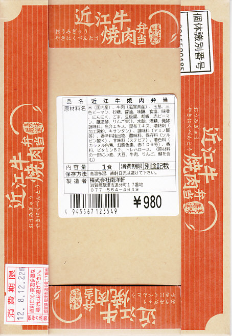 東京駅の駅弁売店「駅弁屋 祭」で販売するために、この売店の開店日である2012年8月7日に東京駅でデビューか。この「近江牛焼肉弁当」(980円)と「近江牛すきやき弁当」(1,050円)「近江牛軍艦巻」(980円)「近江牛三昧」(1,400円)「近江牛しぐれ煮重」(1,470円)の5種が毎日、170種類以上の駅弁を備えるというこの大きな駅弁売店で販売されるようになった。