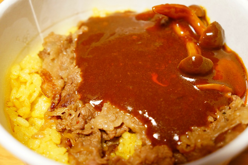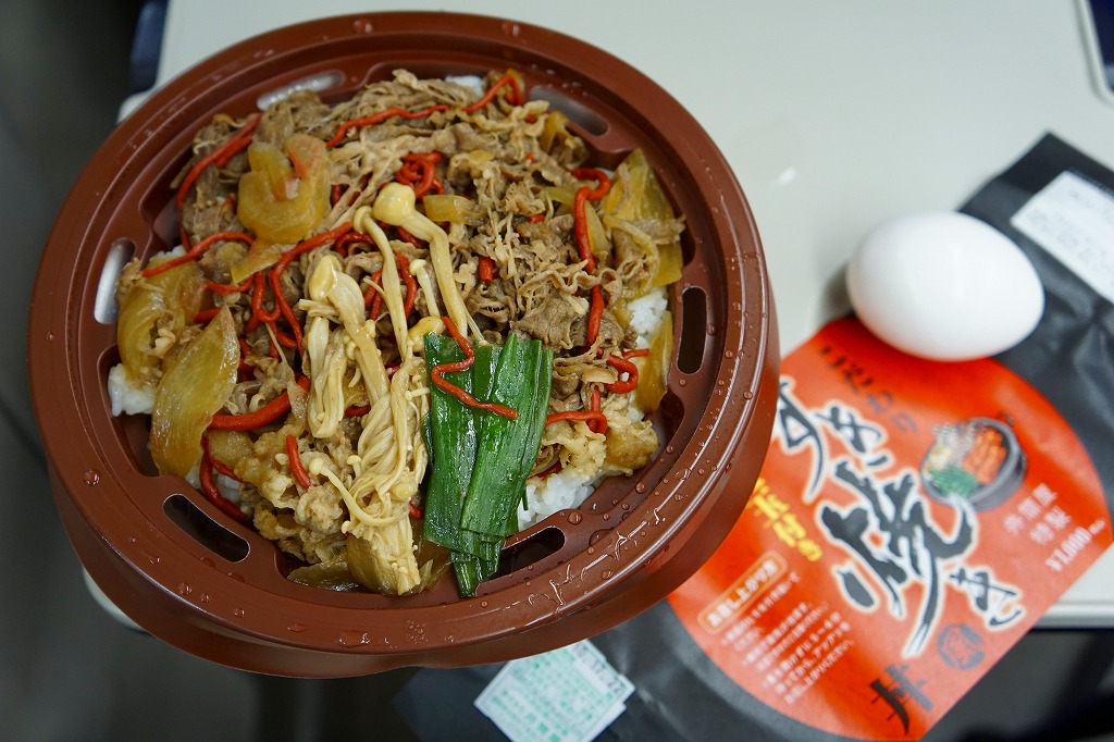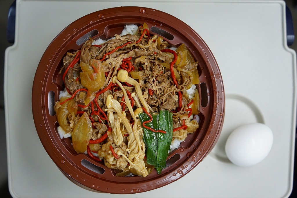 2015(平成27)年秋の新作か。円形の加熱機能付き容器に白御飯を敷き、エノキとタマネギと赤い糸こんにゃくをたっぷり混ぜた牛肉煮で覆い、青ネギで彩り、温泉卵を別添する。