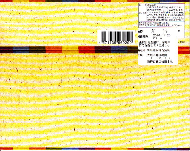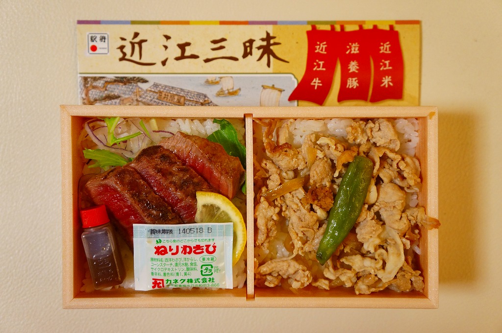京王百貨店の駅弁大会での実演販売のために、2014(平成26)年1月に催事場でデビューか。細長い容器なのに、掛紙は長手の方向にかけている。中身は正方形3区画分で、左に近江牛のハンバーグ、中央に白御飯、右に滋養豚(じようとん)の生姜焼き、というかすき焼き肉タイプの生姜煮を詰める。少量なのに高価だと言われそうだが、味も形もきれいで確か。催事の終了後も販売されたようだが、年内で終売か。