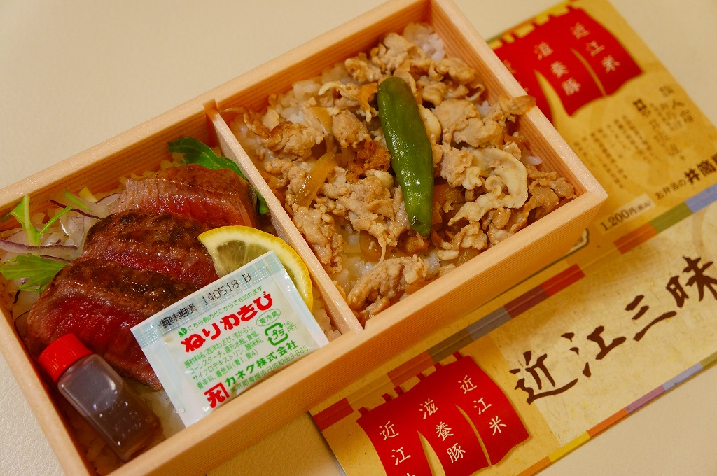2014(平成26)年1月の阪神百貨店の駅弁大会でのみ売られた疑義駅弁。近江米を使う、近江牛のステーキ丼と、滋養豚の豚丼の詰合せ。つまり、2012(平成24)年1月の京王百貨店の駅弁大会でデビューした「近江牛しょいめし」の、醤油飯の牛飯を白飯の豚飯に入れ替えたもの。催事場での大量実演販売の弊害か、そういう商品設計になっているのか、豚が固くて薄味が過ぎて、その風味はなかった。