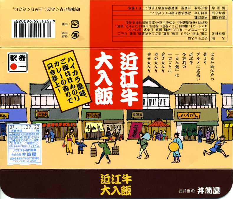 2006(平成18)年9月に発売。スリーブには宿場町生まれの商店街を思わせるイラストを描く。長方形のプラ容器に、カレー風味の御飯を詰め、近江牛のタマネギ入り牛肉炒めを載せ、パセリと赤かぶ漬で彩る。