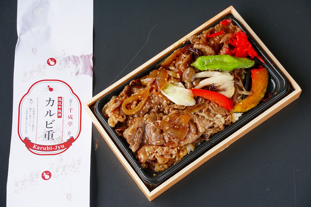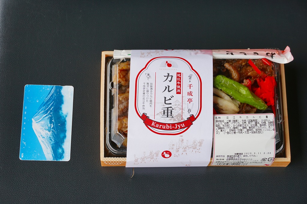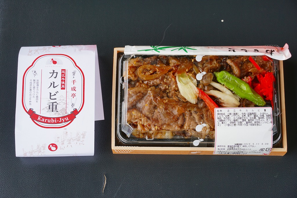 米原駅では2025(令和7)年3月に発売。前月での米原駅の駅弁屋の撤退により、新幹線改札内で駅弁を販売した売店には、京都駅や新大阪駅などで売られる駅弁の一部に加えて、この彦根の宅配弁当店の「カルビ重」(1,500円)「浪漫弁当」(1,400円)「焼豚重」(1,300円)が置かれるようになった。販売はコンビニ向け冷蔵什器でも、午前中の訪問時には温かいお弁当だった。