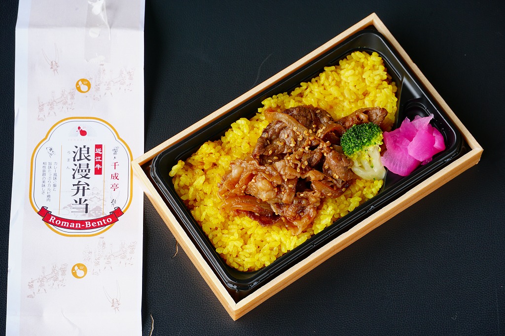 京王百貨店の駅弁大会での実演販売のために、2013(平成25)年1月に催事場でデビューか。耐水耐油の紙カップにカレー風味の黄色い御飯を詰め、近江牛の牛肉煮を乗せ、しめじとマッシュルームの洋風きのこソースが入るプラ製カップでふたをする。