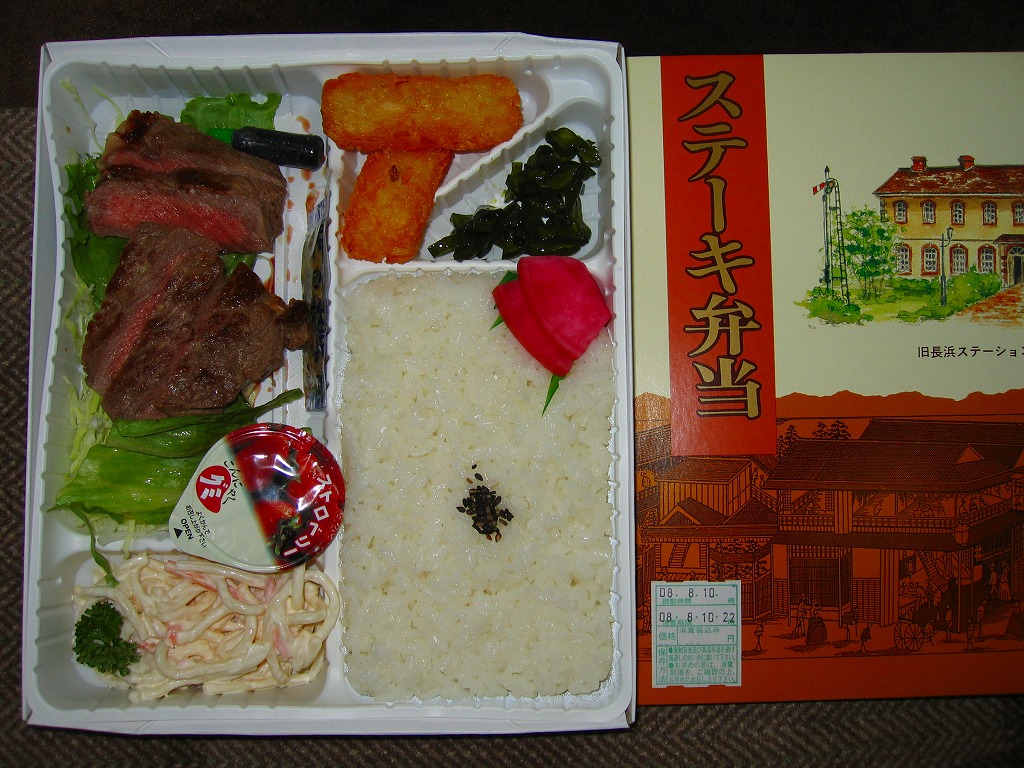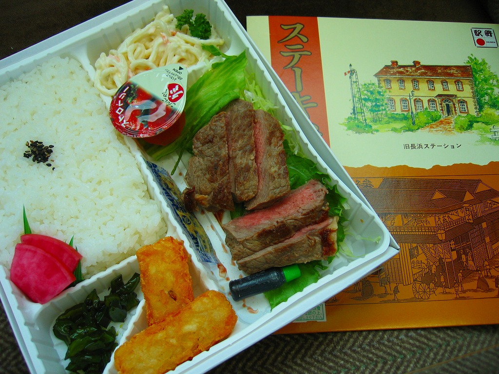 1975(昭和50)年に発売された、米原駅弁の主力級。2000年頃までは「近江牛ステーキ弁当」の名で売られていた。長浜駅旧駅舎に駅弁屋創業時の社屋を描いた、正方形のボール紙容器の中に、白いトレーを入れる。内蓋代わりに近江牛を舌足らずに自賛するボール紙が1枚。