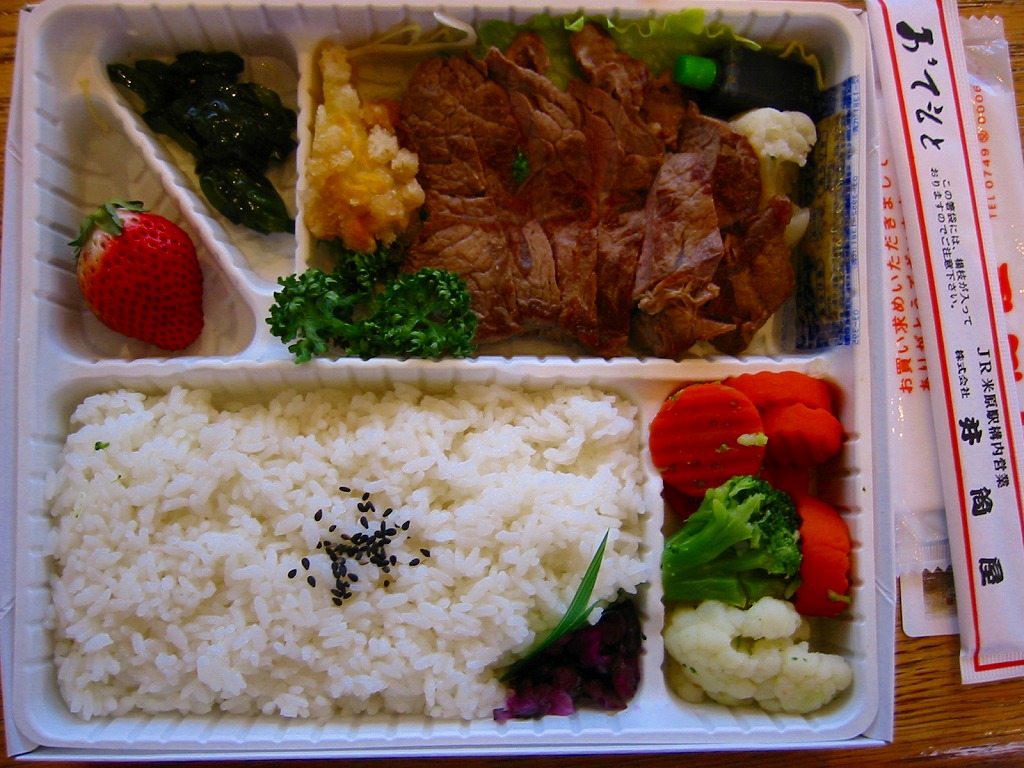 催事場での大量実演販売の弊害か、そういう商品設計になっているのか、醤油味をうたう割には薄味が過ぎてその風味はない。ステーキには米原駅弁のうまさがあるが、牛肉炒めは筋が固いだけ。同じ値段ならば従前からの「ステーキ弁当」のほうが断然に上だと感じる。