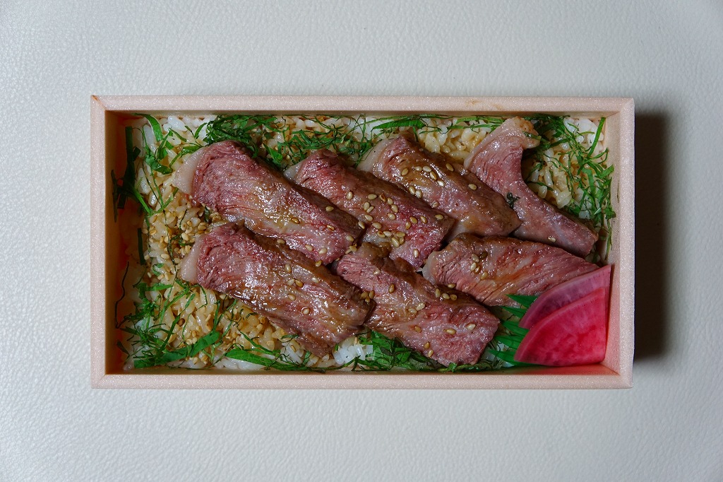 中身はパッケージの写真のとおり、白御飯に白ごまを振り、大葉の細切りを敷き、USBスティックメモリ大にカットした近江牛ステーキを7切れ並べ、赤かぶ漬を添えるもの。近江牛の霜降り肉の脂身が、常温でくどくない程度に香り、大葉とゴマが風味にアクセントを付ける。2020年までの販売か。