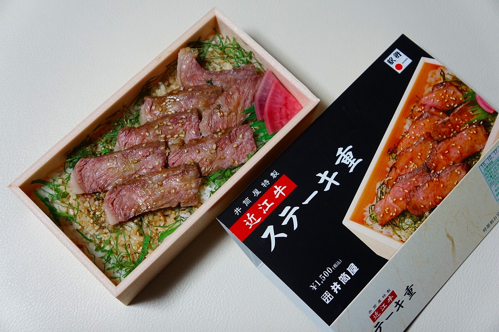 京王百貨店の駅弁大会での実演販売のために、2012(平成24)年1月12日にその催事場でデビューか。小柄な長方形の容器に、商品名を簡単に描いた朱色の掛紙を巻く。正方形2区画分の中身は、片方に醤油飯の牛飯、もう片方に醤油ダレの近江牛ステーキ飯。米原の醤油と滋賀の牛肉を使うことが特徴。