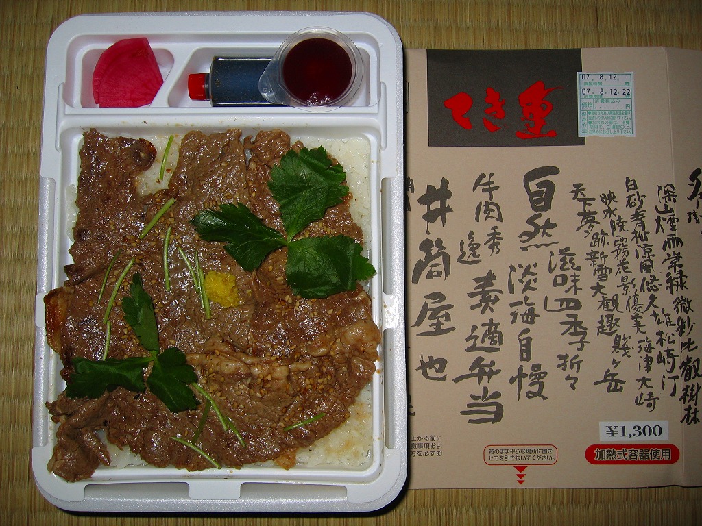 米原駅の加熱機能付き容器を使う牛肉駅弁。この正方形の大きな容器をはめる紙枠には漢字で様々な語句を並べる。中身はほのかに醤油のたれが効いた薄切り牛肉で近江米の白御飯を覆い、ミツバを振っておろし生姜を添え、しば漬とこんにゃくゼリーを添えるだけの直球勝負。見栄えでまったく飾り気のない牛肉がボリューム感を出し、加熱式にしては腹持ちもいい。そして肉の風味だけで旅客を魅了できる、実力派の人気者。価格は2007年の購入時で1,300円、2022年時点で1,500円ただし販売休止中。この年で終売か。