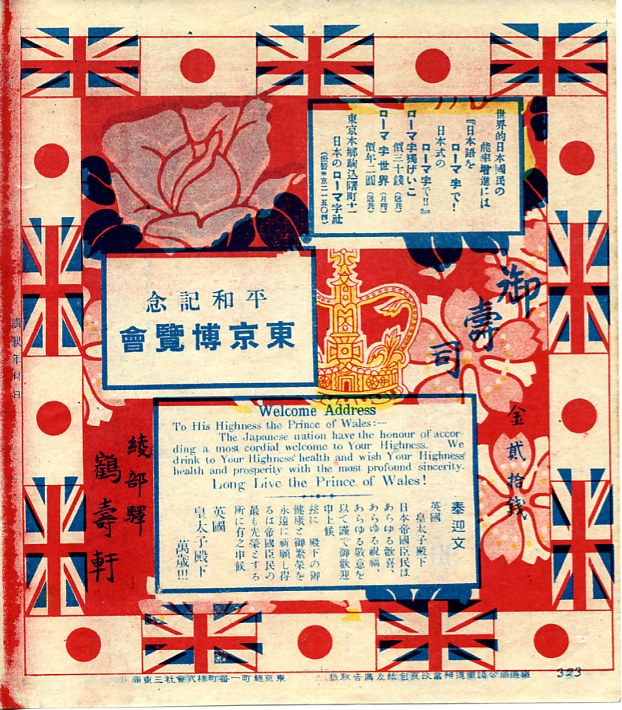 1922(大正11)年の調製と思われる、昔の綾部駅弁の掛紙。同年に上野公園で開催された平和記念東京博覧会で英国の皇太子殿下が来日されたことを記念して、全国各地の駅弁屋が同じデザインの記念掛紙を使用したもの。周囲に日本と英国の国旗を配し、右に駅弁の名前、左下に調製元、下部に日英の歓迎文、上部の2枠は広告枠。