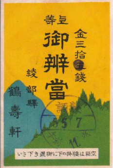 1930(昭和5)年5月17日の調製と思われる、昔の綾部駅弁のとても小さな掛紙。調製元は21世紀と同じ鶴寿軒。昭和初期のデフレの影響か、価格が35銭から30銭に訂正されている。