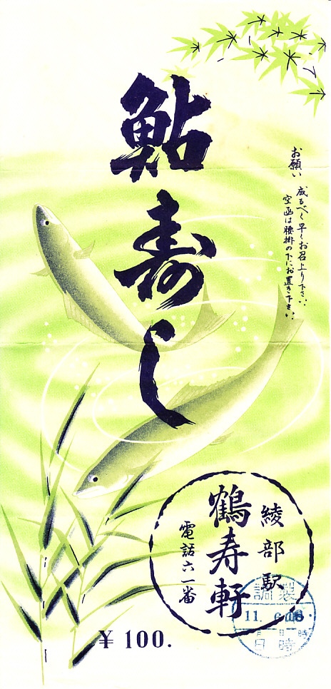 1960年代の調製と思われる、昔の綾部駅弁の掛紙。この地域で第二次大戦前から21世紀まであまり変わらなかった、アユのイメージイラスト。