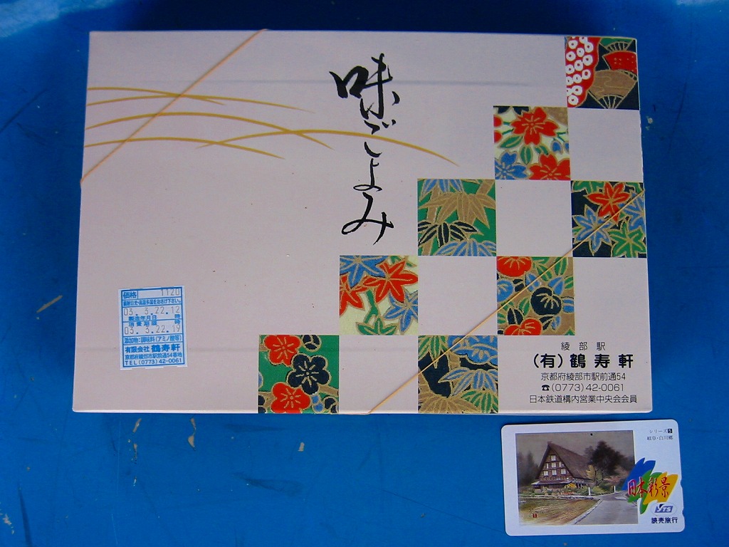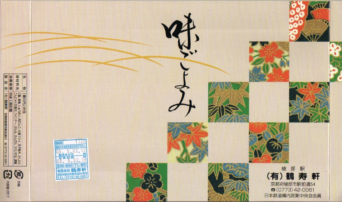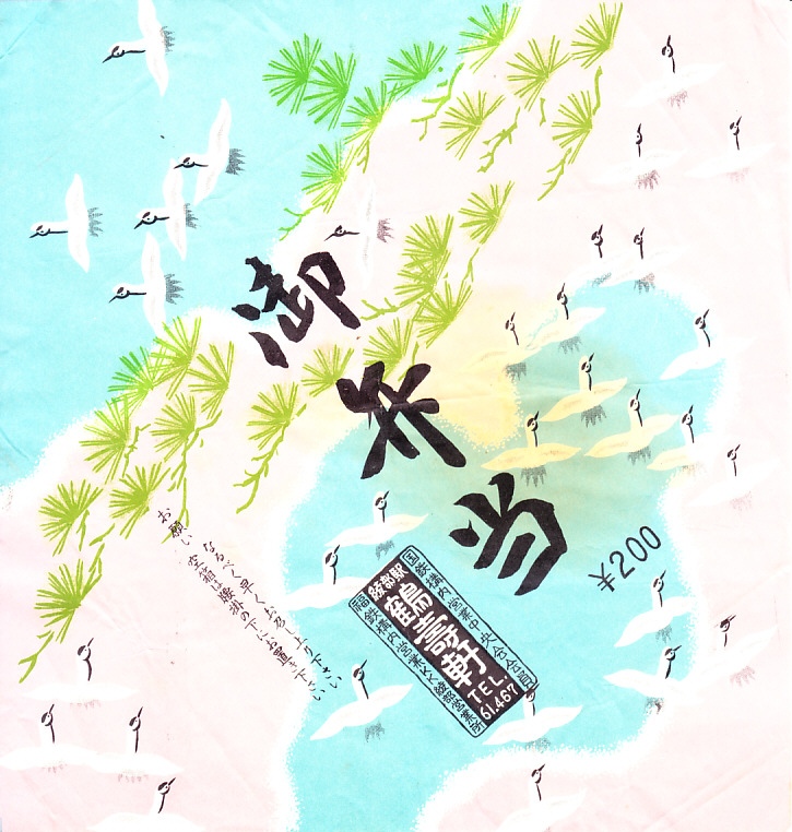 1960年代のものと思われる、昔の綾部駅弁の掛紙。一般的な海や沼に松と鳥の絵柄か、この頃にはほぼ絶滅していたコウノトリが舞う姿を描いたか願ったものか。