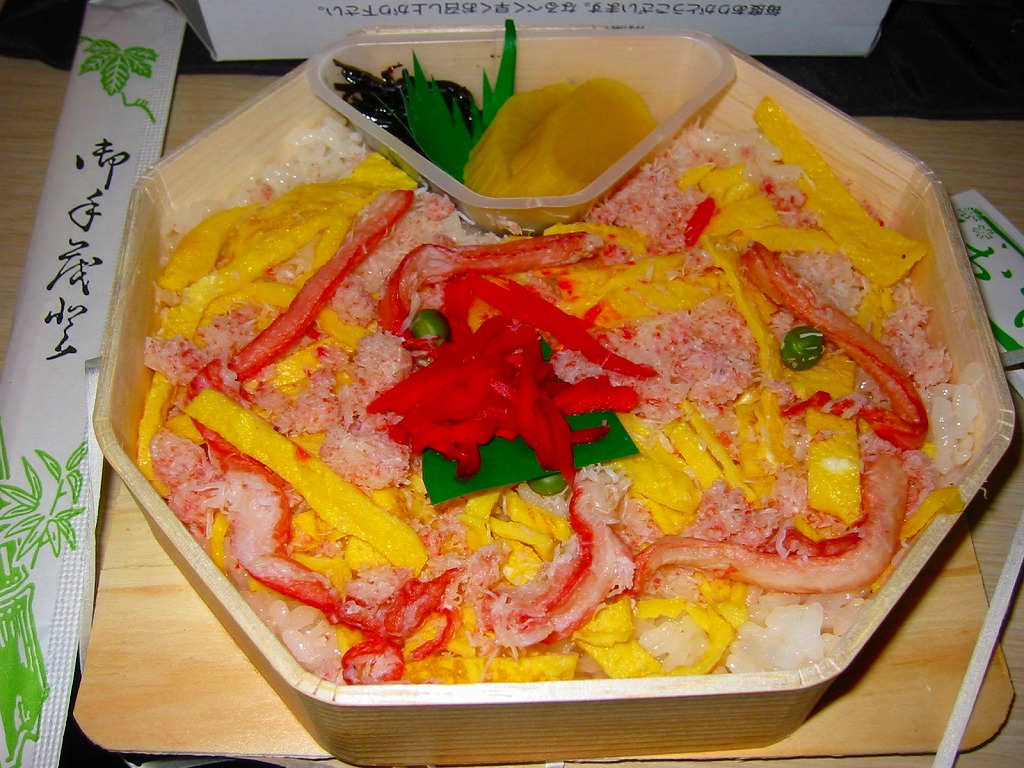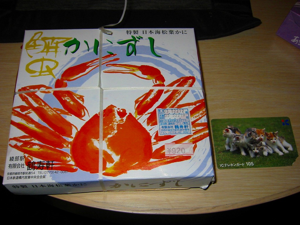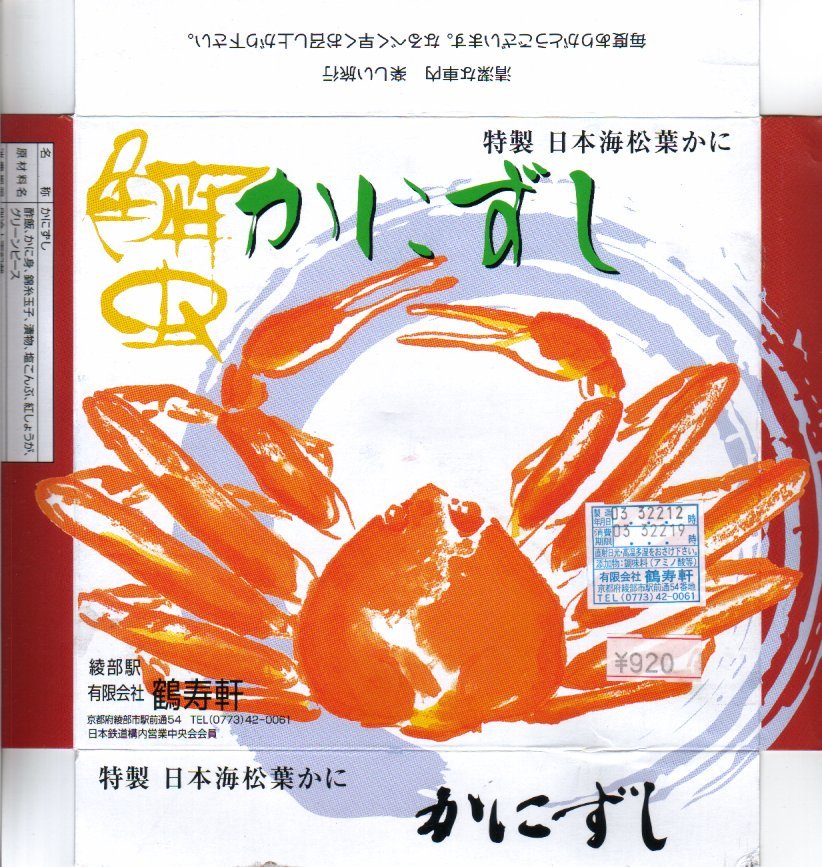 フタも底も枠も経木の容器に、カニを描いたボール紙のふたをかける。中身は酢飯の上に素朴な切り味の錦糸卵と、日本海松葉蟹とうたうカニの足の身とフレークを敷き詰め、グリーンピースで見栄えを整える。ふわりとした甘酢の酢飯にやはりふわりとした卵とカニは、香りほのかで柔らかく、経木の香りも加わり京らしい上品なカニ寿司駅弁に仕上がった。2004年12月時点で存廃不詳。どうも人知れず消えた模様。