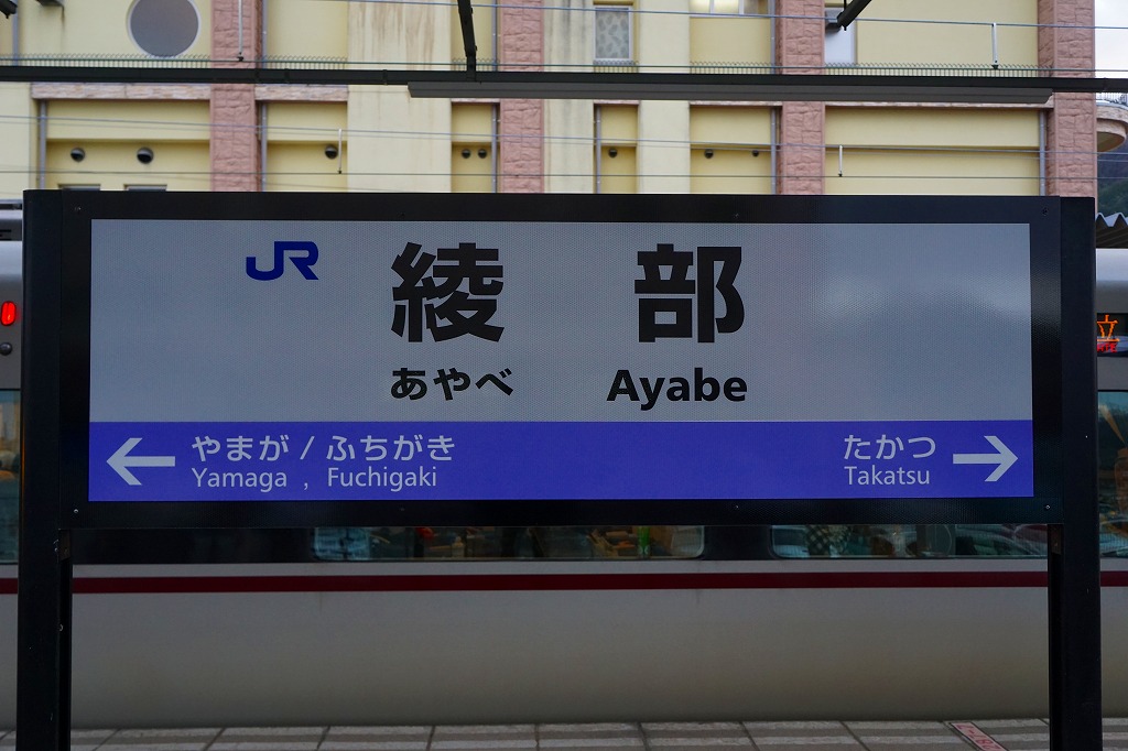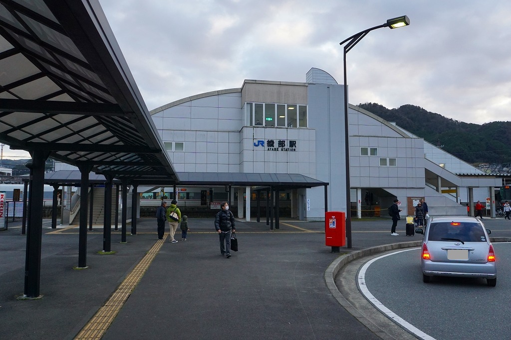 京都駅から特急列車で1時間強。綾部市は京都府の北部に位置する、人口約3万人の内陸工業都市。郡是製糸(グンゼ)と大本教の街。山陰本線が舞鶴線を分ける駅では、大正時代から21世紀に入るまで、ホーム上で駅弁が売られていた。1904(明治37)年11月3日開業、京都府綾部市幸通り東石ヶ坪。