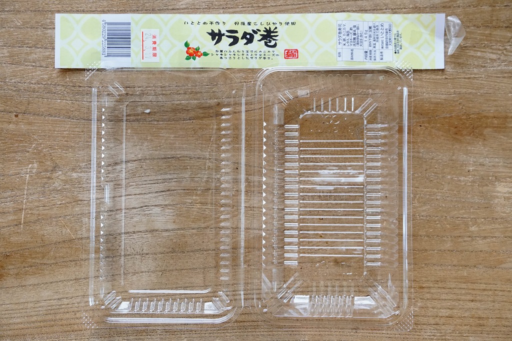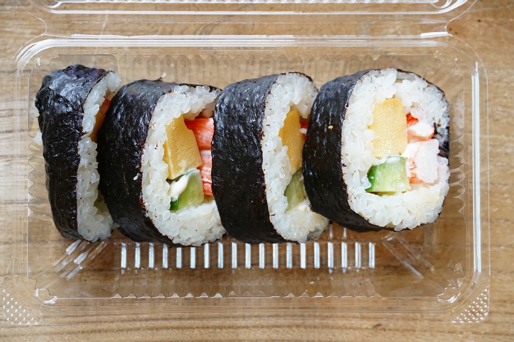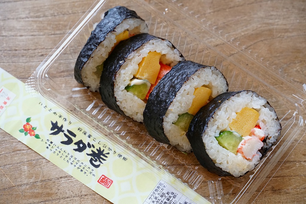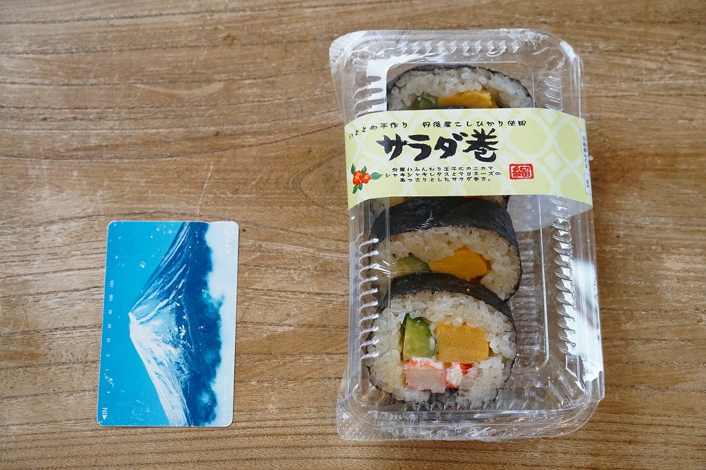 天橋立駅の売店で買えた惣菜。きゅうりと玉子焼とカニかまぼこのマヨネーズ和えを具とした太巻き寿司を4切れ、透明な惣菜容器に詰めて、商品名の掛紙を巻く。掛紙に「いととめ手作り」「丹後産こしひかり使用」とある、地元のお惣菜。調製元は京丹後大宮駅前のぼたもち店。