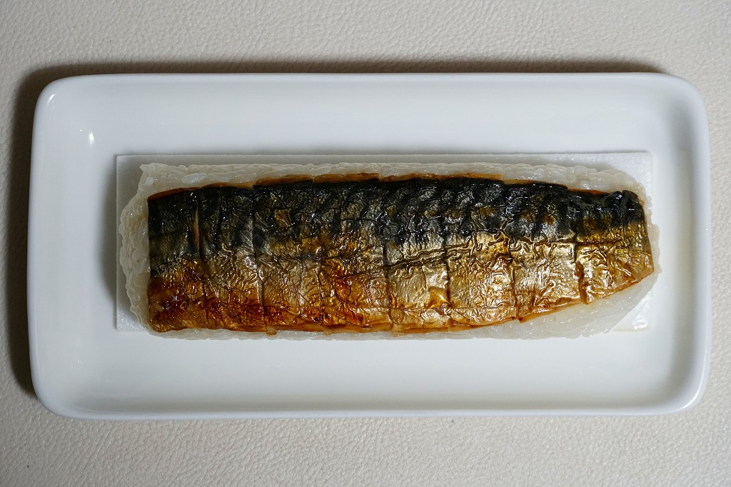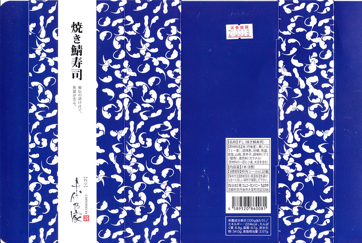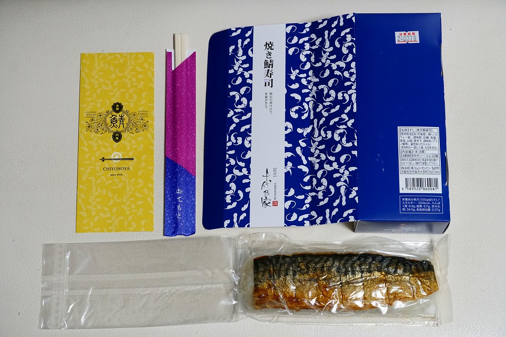 天橋立駅の売店で買えた惣菜。商品名のとおり、酢飯に焼きサバを貼り合わせた棒寿司が1本、フィルム包装で密封され、青い紙箱に収まる。値段も分量もコンパクトな、普通においしい焼きサバ寿司。駅では茶色い箱の「牛肉いなり寿司」(920円)と、黄色い箱の「丹後ばら寿司いなり」(830円)も販売するらしいが、いずれも駅弁と名乗ったり紹介されたことは、ないと思う。調製元は京丹後大宮駅と峰山駅の間の国道沿いで料亭「千代乃家」の仕出し部門と紹介する仕出し弁当店。