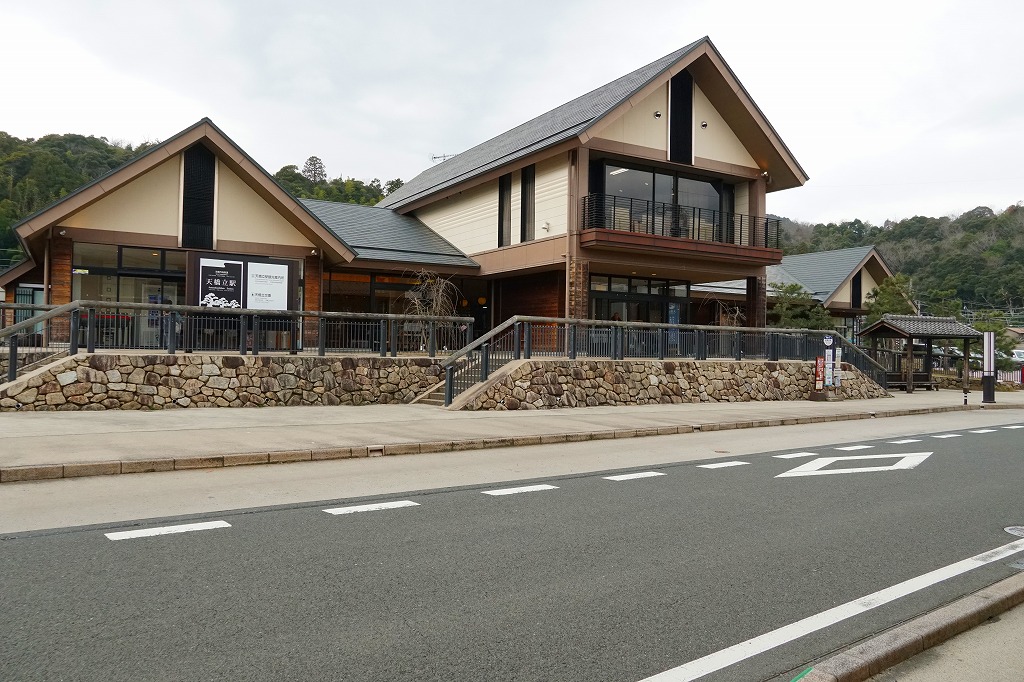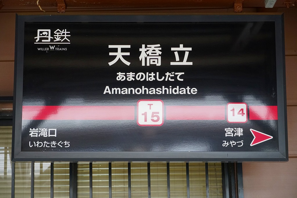 京都駅から特急列車「はしだて」で2時間強。その名のとおり、著名な観光地である天橋立の近くにあり、駅から歩いてその砂州まで行ける。駅弁は1970年代から1990年代まで、西舞鶴駅の駅弁が売られた。以後に公式な駅弁の販売はないが、観光列車「丹後あかまつ号、丹後あおまつ号」の乗客に限り駅で受け取れる予約制の弁当「えきべん」がある。1925(大正14)年7月31日開業、京都府宮津市字文珠。