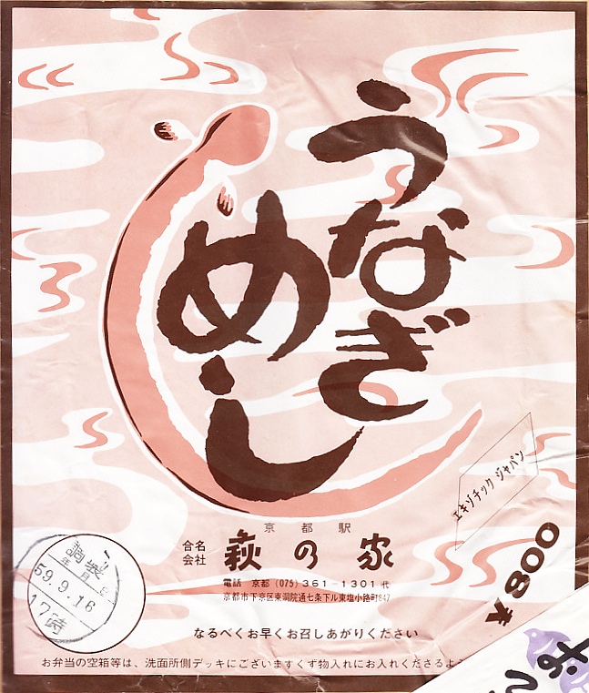 1984(昭和59)年9月16日17時の調製と思われる、昔の京都駅弁の掛紙の一部。その絵柄は上記の2003年のものと変わらない。消費税を考慮すると値段も変わらない。
