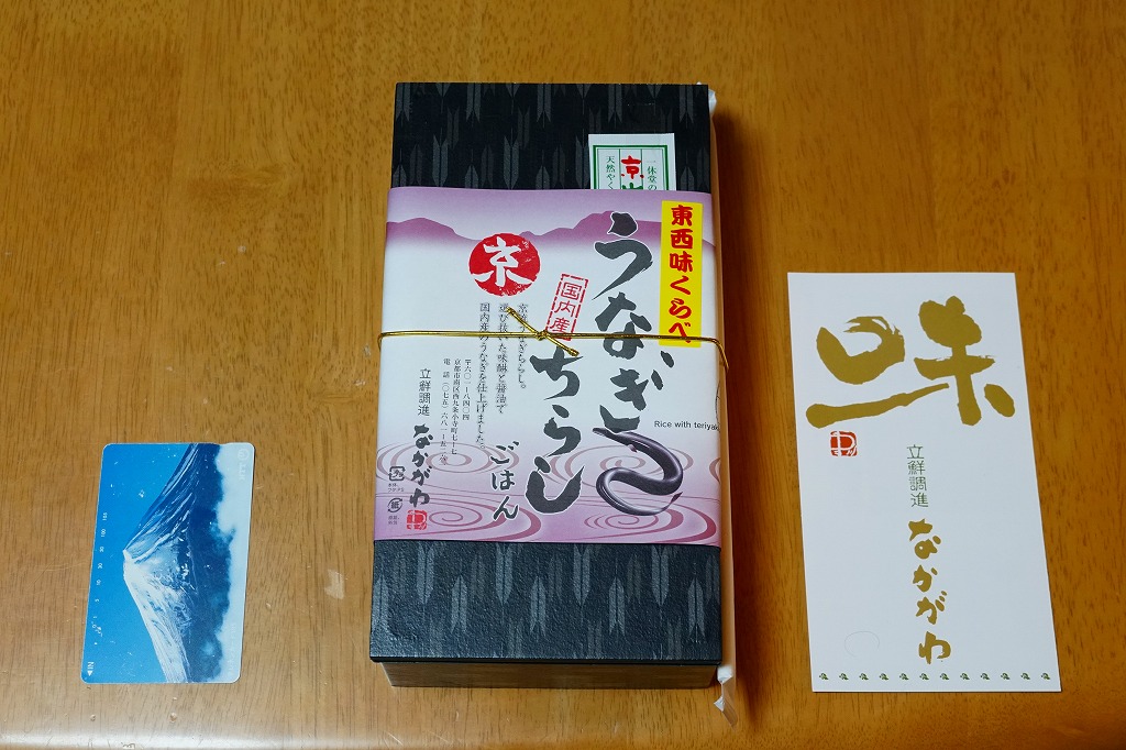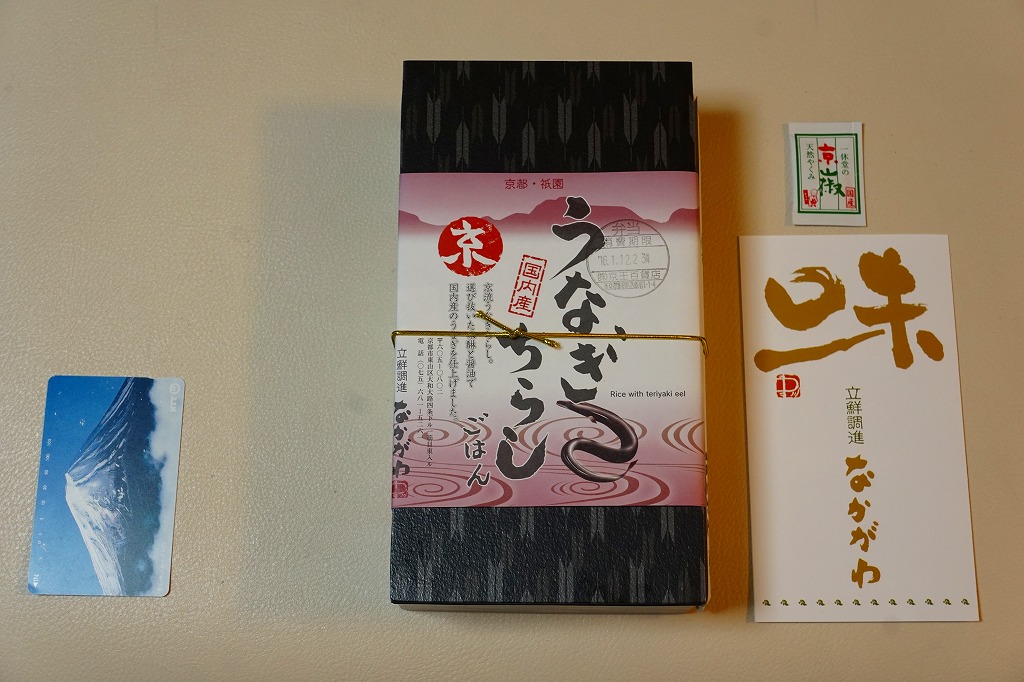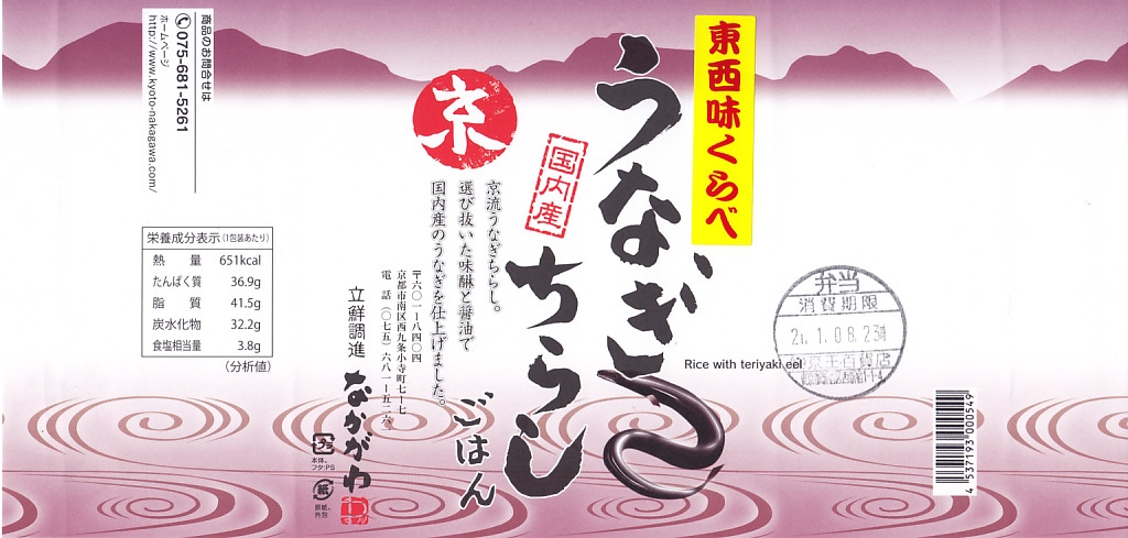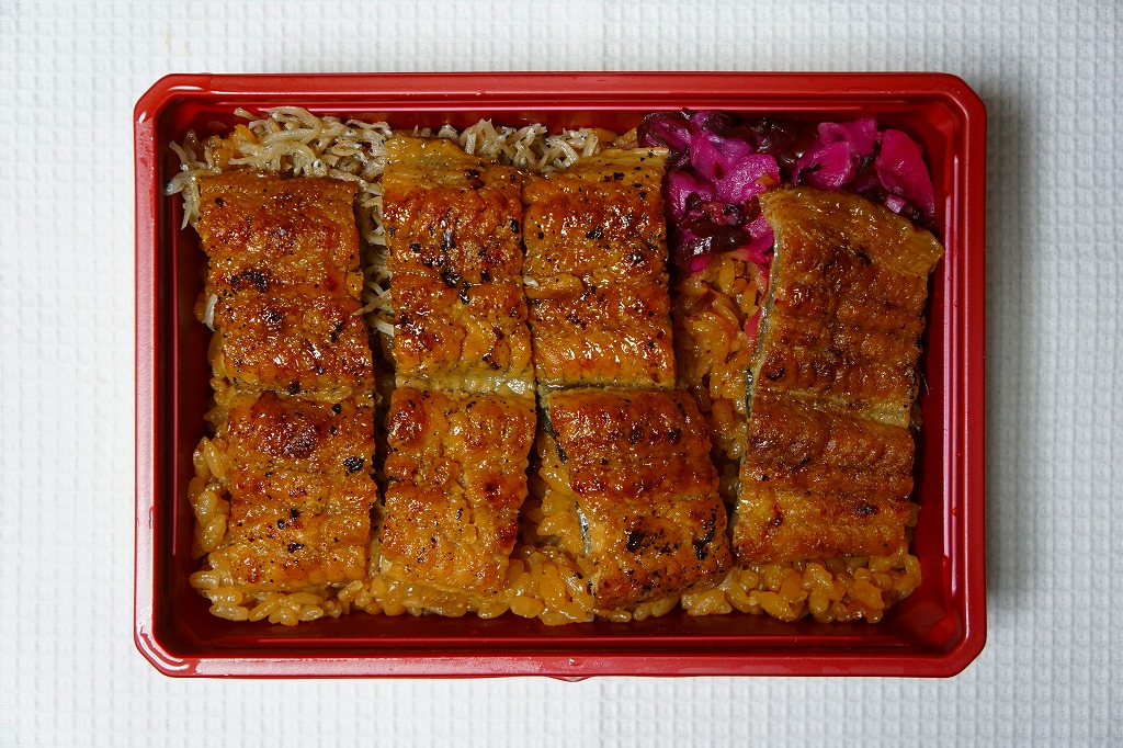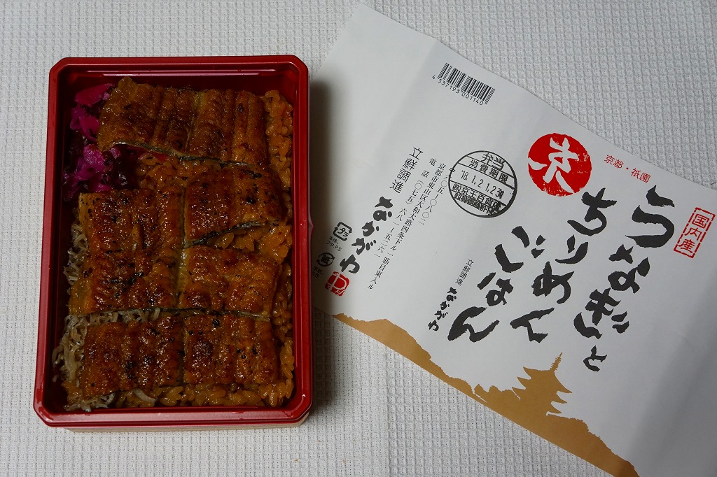 2018(平成30)年1月の京王百貨店の駅弁大会で実演販売。タレ御飯をウナギ蒲焼で覆い、ちりめんと柴漬けを少々添付。味は見てのとおりの鰻重。ウナギ御飯の味が強いので、ちりめんは食感だけに留まる感じ。前年の「うなぎちらしごはん」と違い、これは京王百貨店の駅弁大会でのみ販売し京都駅で売らなかった疑義駅弁だった模様。