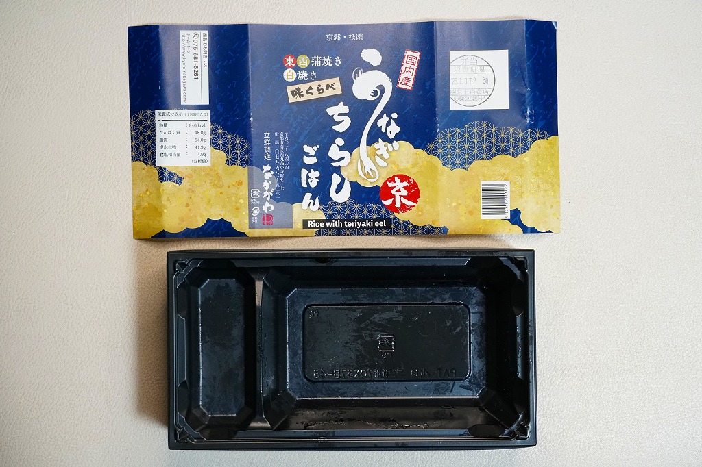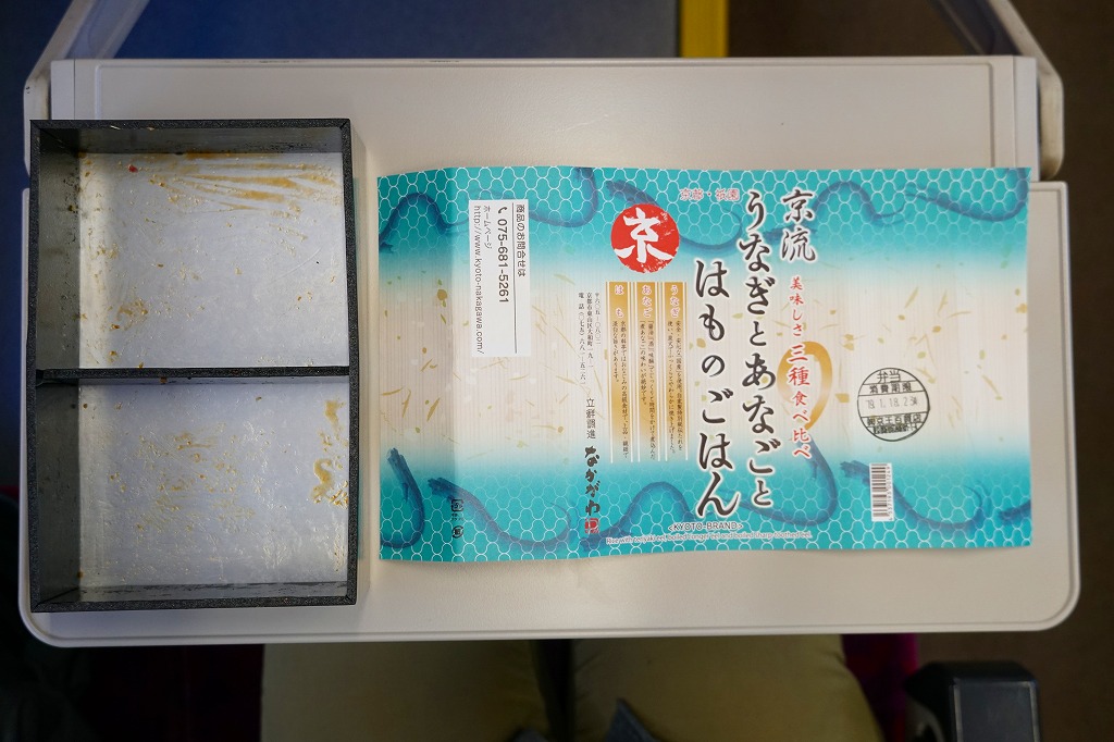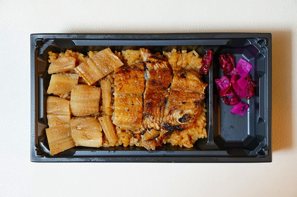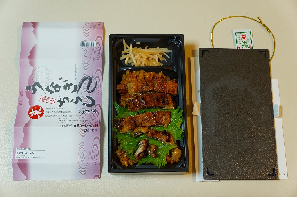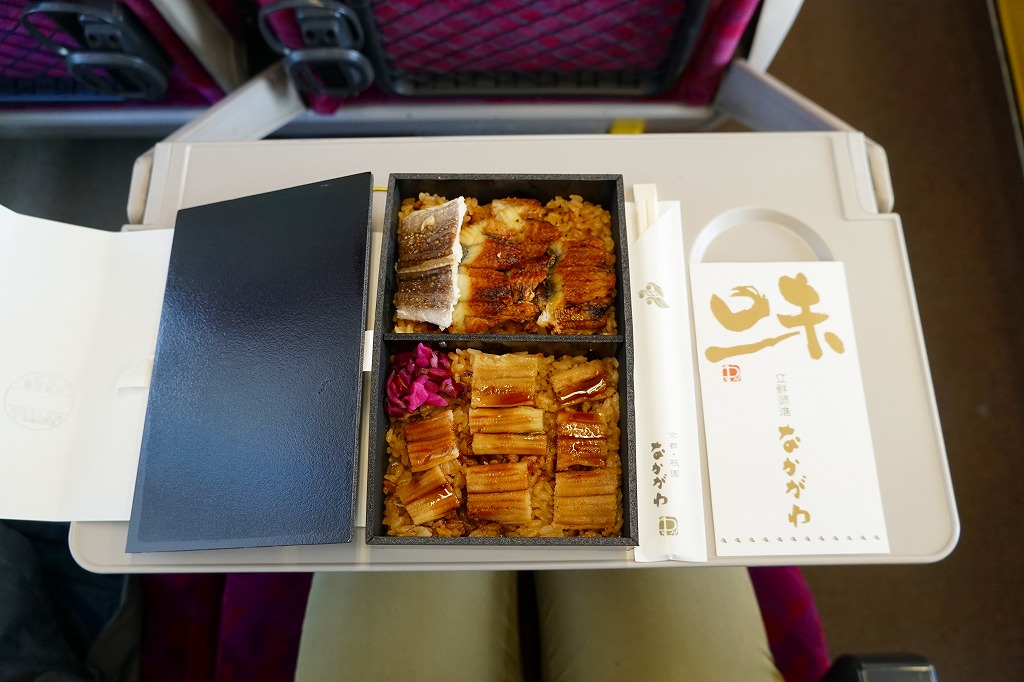 タレが染み込んだ御飯の上に鰻蒲焼が3切れ載る鰻重を、経木の細長い細長い長方形の容器に詰める。京都の町家建築からヒントを得た駅弁だろう。味はよいがずいぶんと高価だという評価がよく聞こえてきて、在来線エリアでは見かけず新幹線改札内で取り扱われているという販売形態は正しそう。