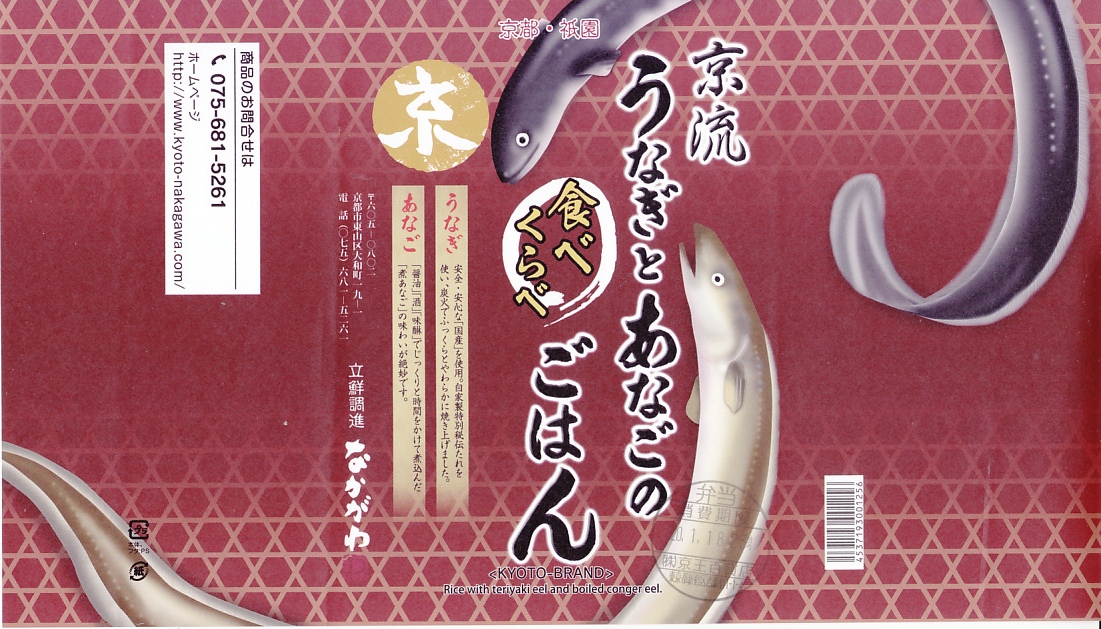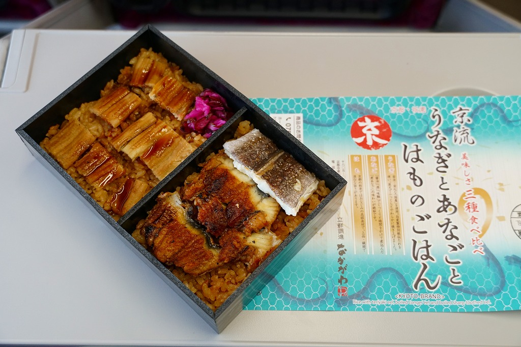 2020(令和2)年1月の京王百貨店の駅弁大会で実演販売。商品名は「うなぎとあなごのごはん」かもしれない。タレ御飯をウナギとアナゴで覆い、柴漬けを添える、相変わらずシンプルな内容。催事場でひっそりと販売し、見た目と味はおとなしく、価格はおとなしくなく、注目されなかった感じ。京都駅で販売したかは分からない。