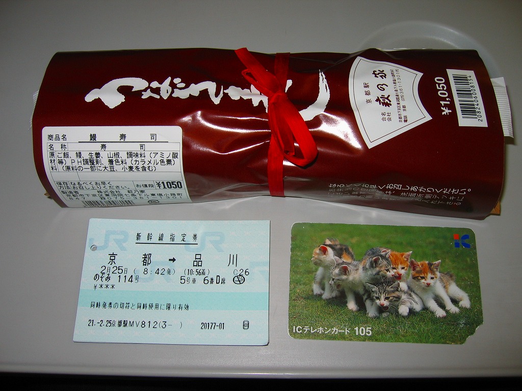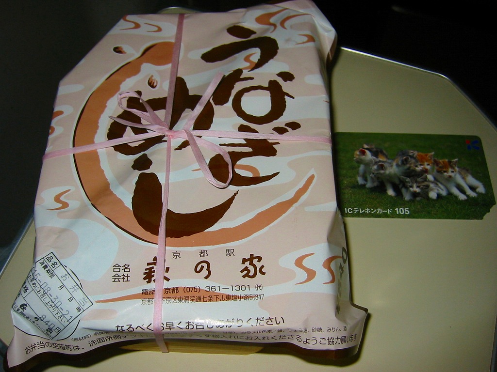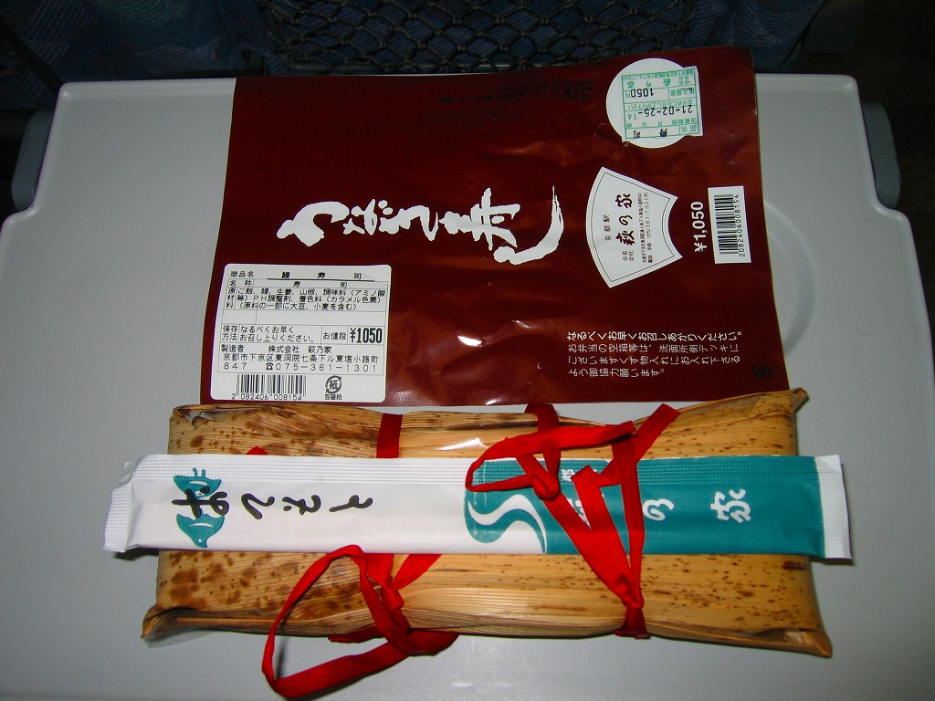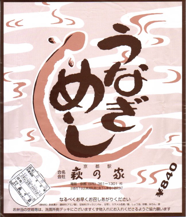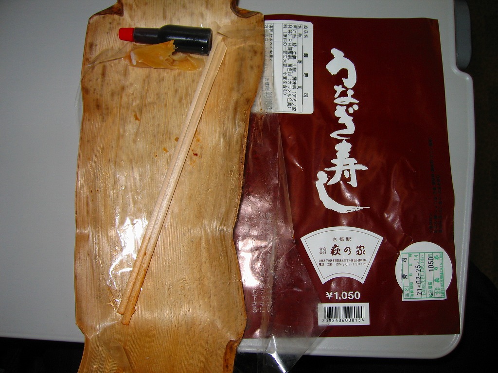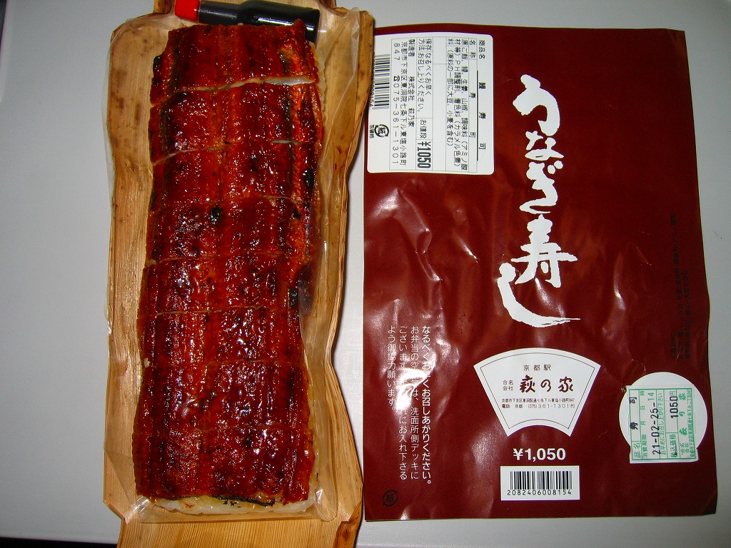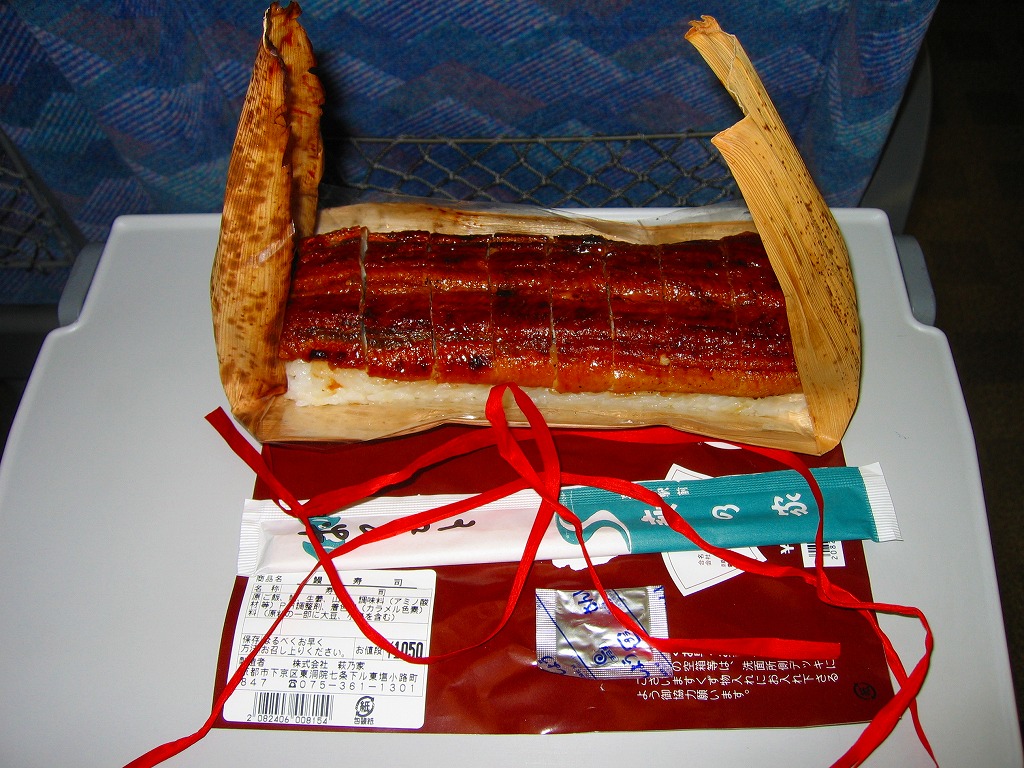 写真のとおりウナギの棒寿司が1本、竹皮に包まれて、ひもでしばられて、写真もイラストも何もない掛紙に巻かれている。風味はなかなかまともなもの。地味が過ぎて今では誰も紹介してくれなくなっているが、京都駅の駅弁屋「萩の家」のウナギ駅弁は1909(明治42)年以来の伝統を持つ。京の歴史に比べればたいしたことはないけれど、大切にしたい鉄道の味である。