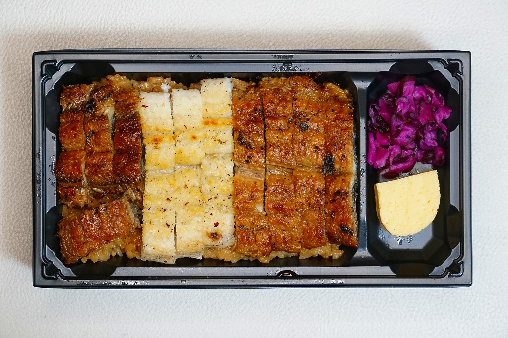 2025(令和7)年1月の京王百貨店の駅弁大会で実演販売。上記の駅弁「うなぎちらしごはん」について、ウナギを替えて大葉を省き、掛紙を新たに作り、現地版のほぼ倍額で販売した。ここでのウナギは3種類。真ん中が白焼きで、その左右に関東風と関西風の蒲焼きを並べた。下記の4年前に同じ催事場で販売したものよりも、味覚はともかく視覚で差異が出たため、味くらべのアピールが分かりやすくなったと思う。今回もひっそり販売し、この催事でのみ販売した模様。