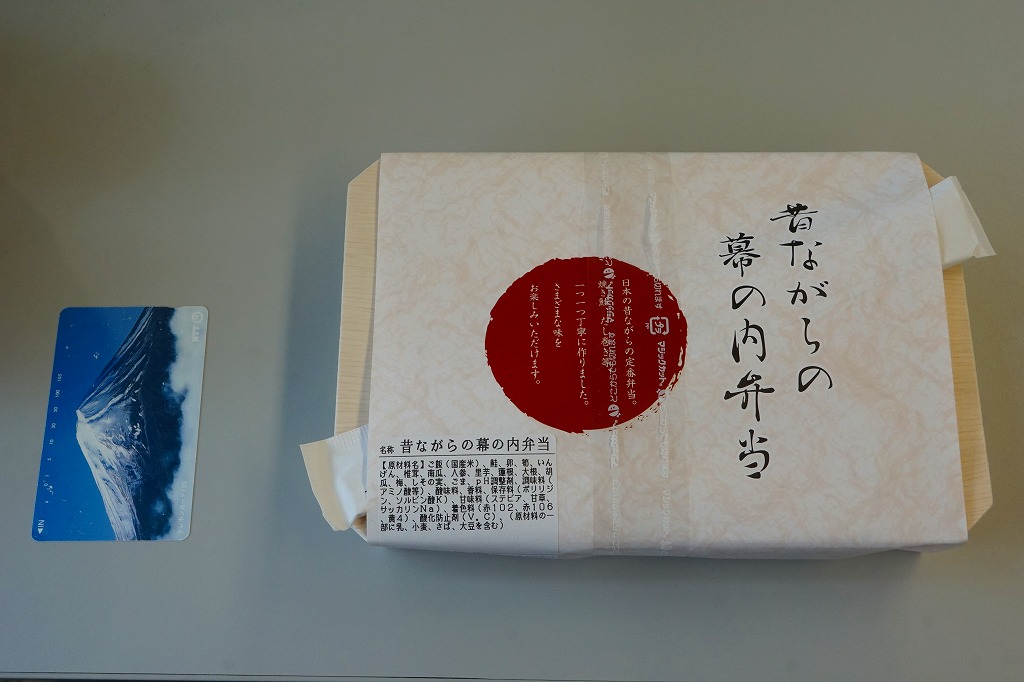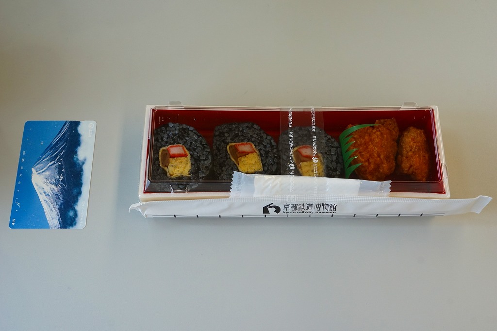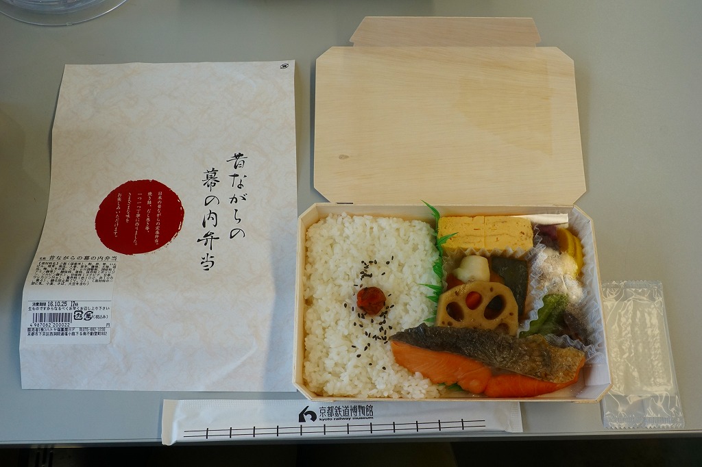 2016(平成28)年4月29日の京都鉄道博物館の開館と同時にデビューした館内弁当のひとつ。掛紙の意匠はまるで日の丸弁当。木質エコ容器の中身は半分がそんな日の丸弁当、御飯の中央に梅干しを配置したもので、半分は焼鮭、玉子焼、煮物類、漬物類。見栄えに加えて御飯の多さとおかずの少なさでも、古風な駅弁を思わせる。2017(平成29)年までに終売か。