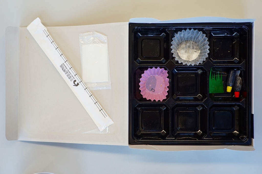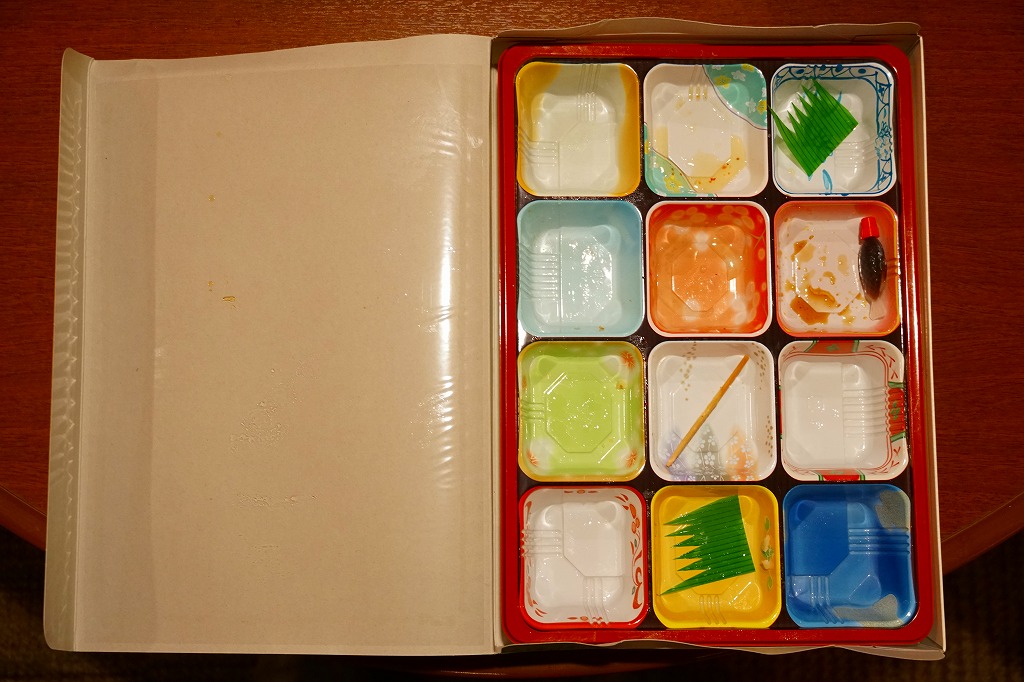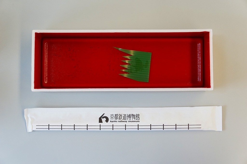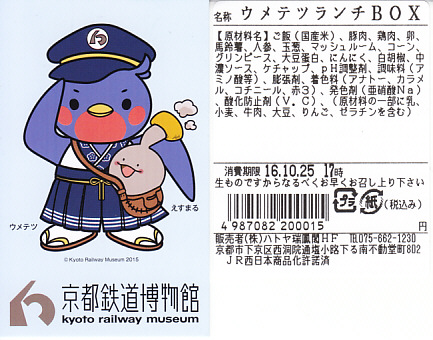 2016(平成28)年10月25日に購入した、京都鉄道博物館のお弁当のふたと添付物。上記の2023年のものと、容器も中身もほぼ変わらない。当時は京都鉄道博物館のキャラクター「ウメテツ」のシールを添付したほか、ふたに描く収蔵車両のアイコンの数や位置が異なる。