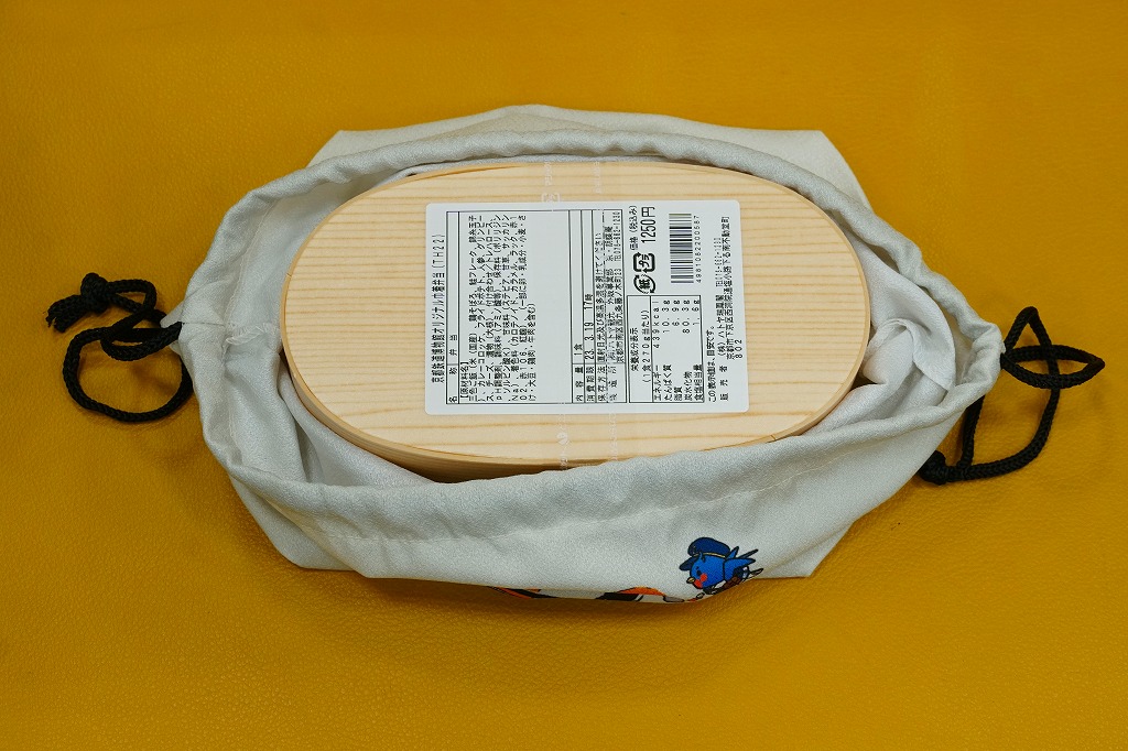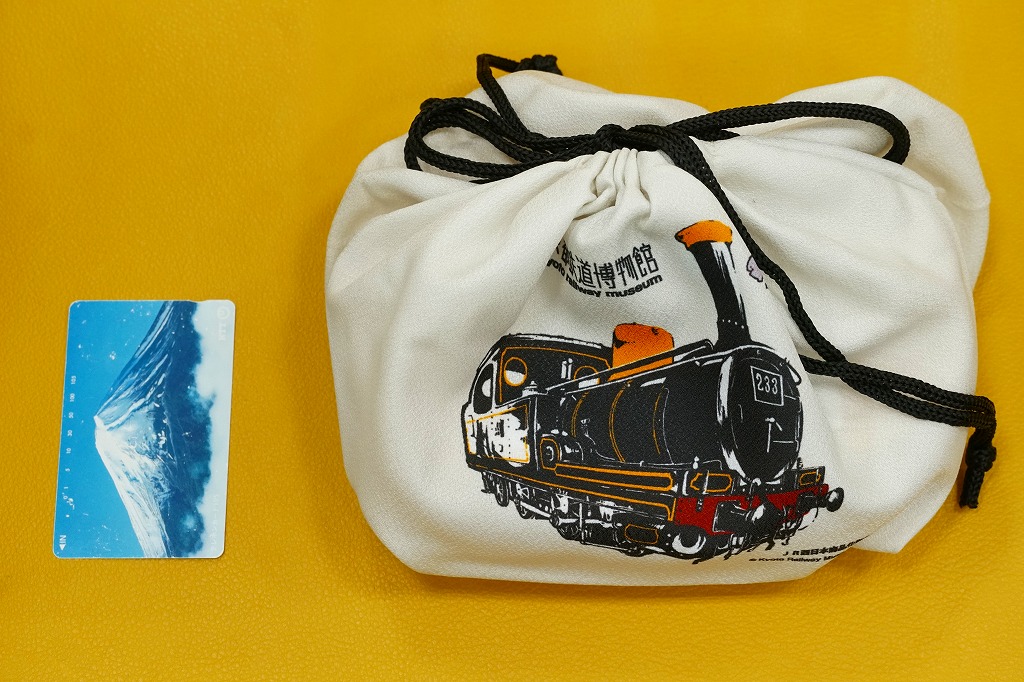 2021(令和3)年までに京都鉄道博物館で発売か。食品表示ラベルや売店掲示での商品名は「京都鉄博オリジナル巾着弁当」。その名のとおり、楕円形の小さな容器を、京都鉄道博物館の名とキャラクター「ウメテツ」と収蔵の233号機関車のイラストを載せたきんちゃく袋に詰める。