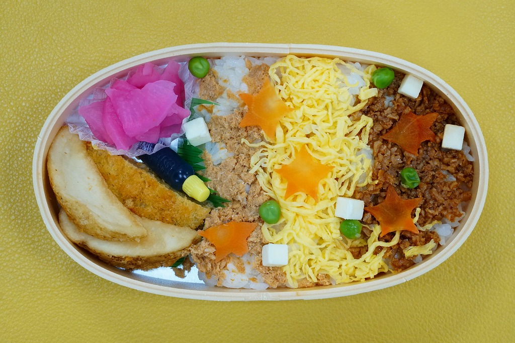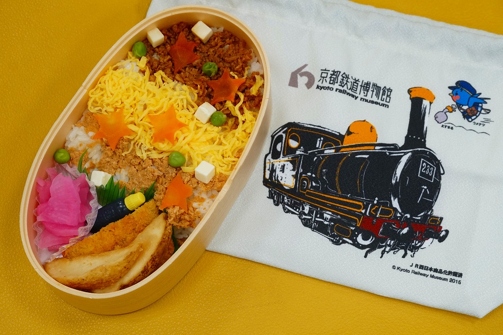中身は白飯を鶏そぼろ、鮭フレーク、錦糸卵で覆い、チーズとグリーンピースと星形のにんじんで彩り、カレーコロッケ、フライドポテト、大根桜漬を添えるもの。過去に東京駅の駅弁や埼玉県大宮の鉄道博物館のお弁当でも採用された、この大きさと素材の巾着袋は、弁当箱向けでも小物向けでも使い回せるので、入館の記念になる。営業事業者の変更により2024年8月限りで終売、9月からは神戸の駅弁が売られる。