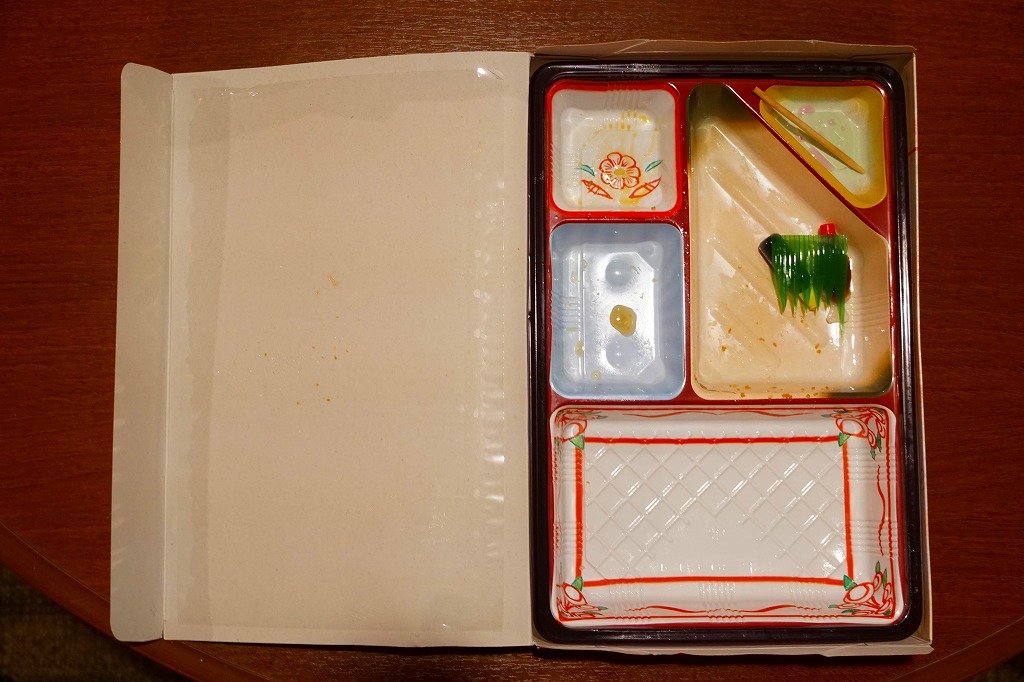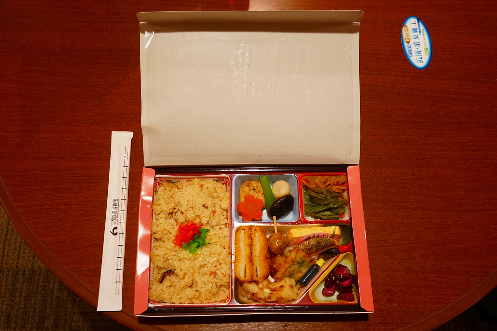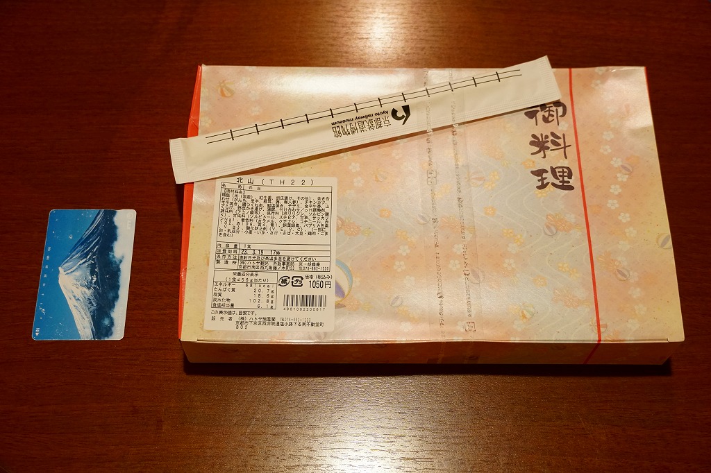 2021(令和3)年までに京都鉄道博物館で発売か。食品表示ラベルや売店掲示での商品名は「北山」。市販のボール紙製仕出し弁当向け容器を使用、器の絵柄を印刷した仕出し向けらしいプラ製トレーに、鶏飯、焼鮭とかまぼこと玉子焼、チキンカツ、鶏つくね串、チヂミ、きんぴらごぼう、里芋や椎茸などの炊き合わせ、山くらげ、野菜かき揚げなどを盛り付ける。まるで慶弔や会議のお弁当。こういうものが観光施設で買われることは、京都らしさなのかどうか、きっとそうでないと思う。営業事業者の変更により2024年8月限りで終売、9月からは神戸の駅弁が売られる。
