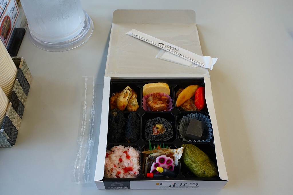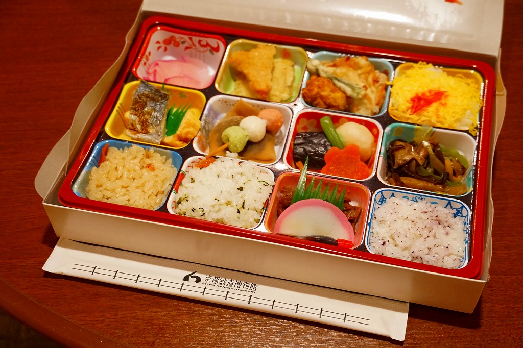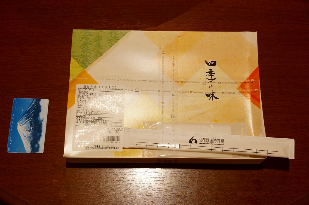2021(令和3)年までに京都鉄道博物館で発売か。食品表示ラベルや売店掲示での商品名は「舞妓弁当」。市販のボール紙製仕出し弁当向け容器を使用、器の絵柄を印刷した仕出し向けらしいプラ製トレーに、五目ご飯、赤しそご飯、菜飯、ちらし寿司、サトイモなどの炊合せ、玉子焼と鯖塩焼き、きのこ醤油和え、蛋白しぐれ煮とかまぼこ、鶏肉の香り揚げ、野菜かき揚げ、生八つ橋と三色串天、漬物で12区画。営業時間も展示内容も客層も、酒向けでない施設で売られる、おつまみ弁当。営業事業者の変更により2024年8月限りで終売、9月からは神戸の駅弁が売られる。