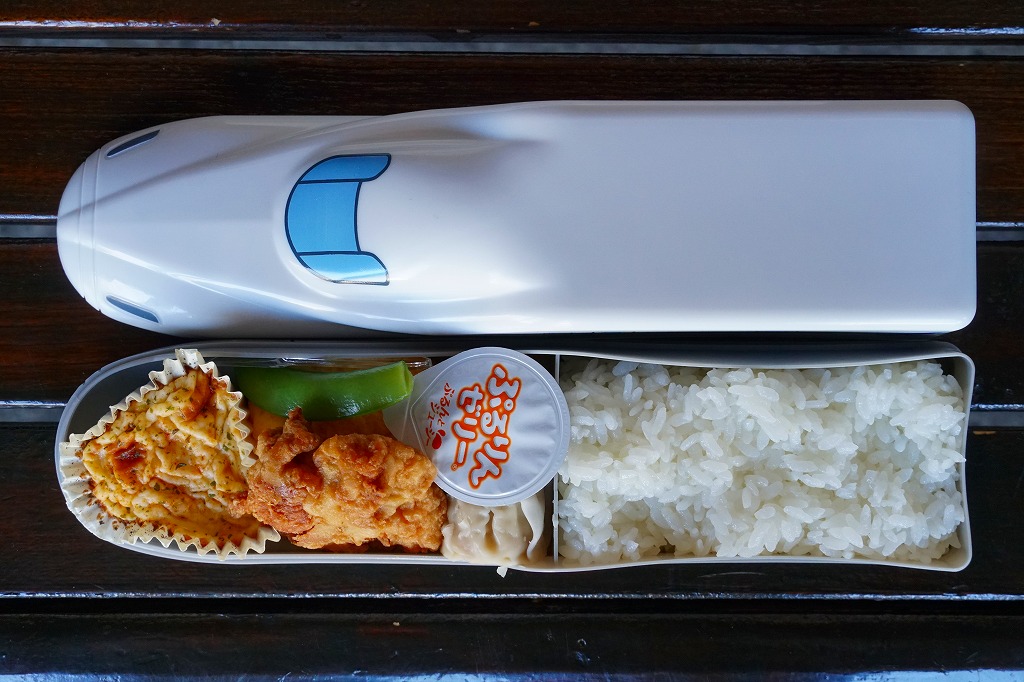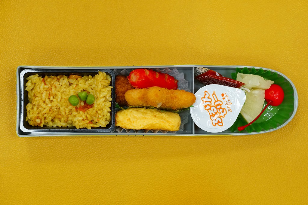 2021(令和3)年までに京都鉄道博物館で発売か。東海道・山陽新幹線のN700A新幹線電車の先頭車の形状を模したプラ容器に、白飯、プレーンオムレツ、ベーコングラタン、鶏唐揚、肉しゅうまい、オレンジゼリーなどを詰めたお子様ランチ。
