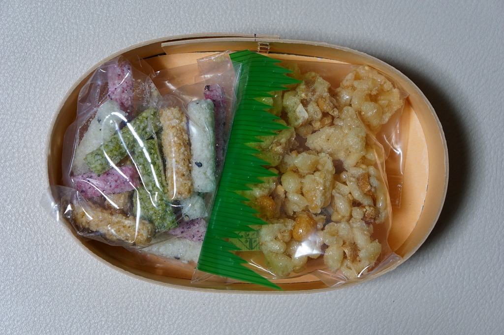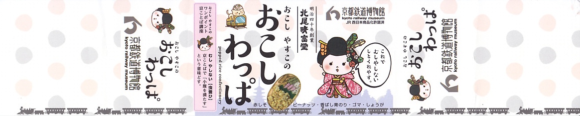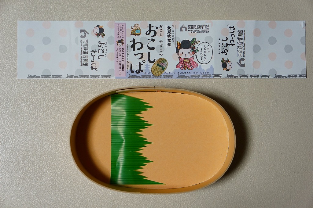 京都鉄道博物館の売店で買えた「駅弁」。木目柄のボール紙でできた楕円形の容器に、赤しそ、香ばし青のり、ゴマ、しょうがのおこしと、ピーナッツのおこしが、それぞれ袋詰めで収まる。容器も丸ごと袋詰め。ということでこれは、駅弁の姿をしたお菓子。姿は小さく軽いのに、値段は普通の駅弁に匹敵する高さ。
