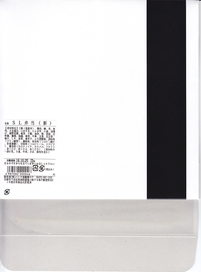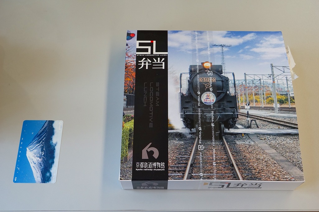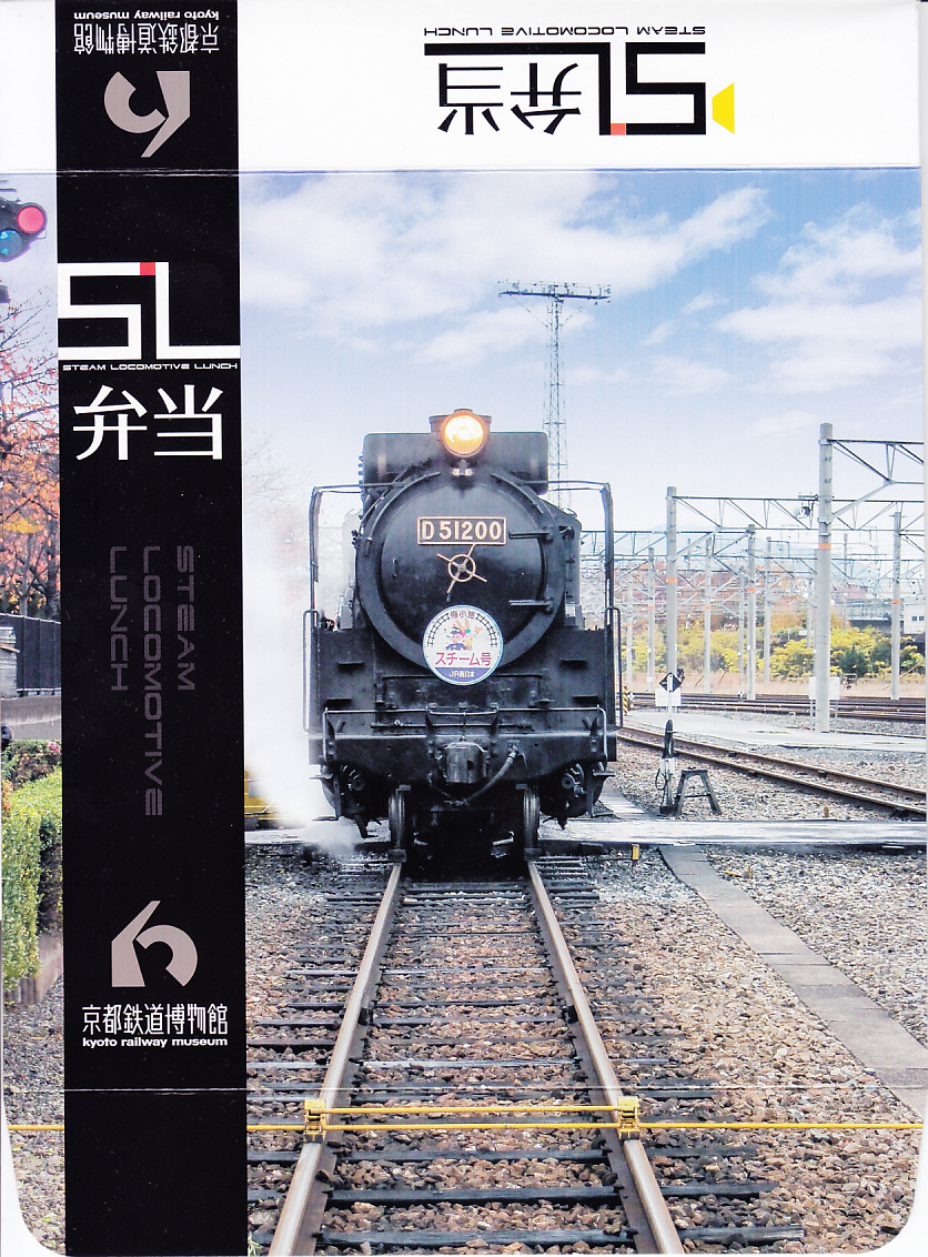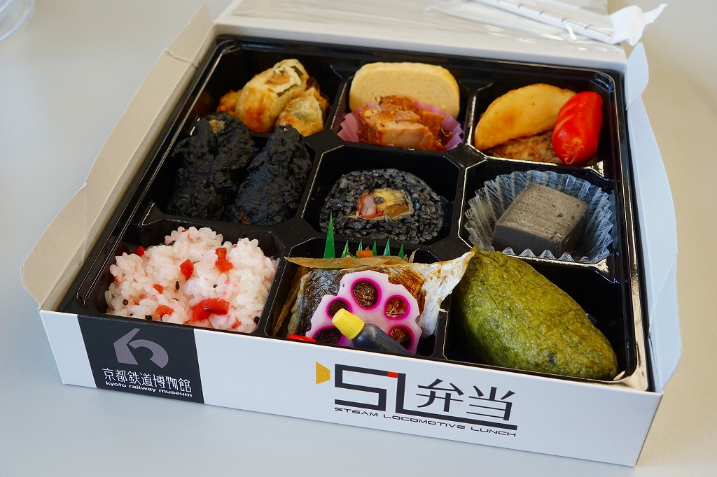 2016(平成28)年4月29日の京都鉄道博物館の開館と同時にデビューした館内弁当のひとつ。博物館の敷地内を往復するSL列車「SLスチーム号」の写真を印刷した専用の紙箱を用意、9区画の中身は真っ黒な太巻と梅御飯、抹茶いなり、真っ黒なかき揚げ、鶏照焼、肉春巻、玉子焼、ハンバーグとウインナーとポテトフライ、黒ごま豆腐など、主に黒いものと揚げもので固めた内容。調製元は京都市街で京都駅と京都鉄道博物館の間にあるホテル。値段は2016年の購入時で1,100円、2020年時点で1,050円またはイートインで1,069円。2021年から販売休止の扱いか。営業事業者の変更により2024年8月限りで終売、9月からは神戸の駅弁が売られる。