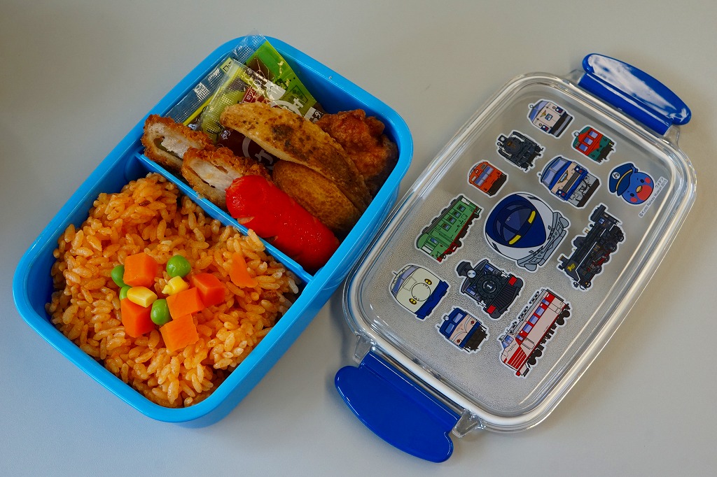 2016(平成28)年4月29日の京都鉄道博物館の開館と同時にデビューした館内弁当のひとつ。使い捨てるものでない市販レベルの青い弁当箱には、博物館のキャラクター「ウメテツ」や、収蔵車両のアイコン7点が描かれる。中身はチキンライスに鶏唐揚、ウインナー、フライドポテト、コロッケ、ハンバーグ、ソース、ケチャップなどという、サイズも分量もコンパクトなお子様ランチ。営業事業者の変更により2024年8月限りで終売、9月からは神戸の駅弁が売られる。